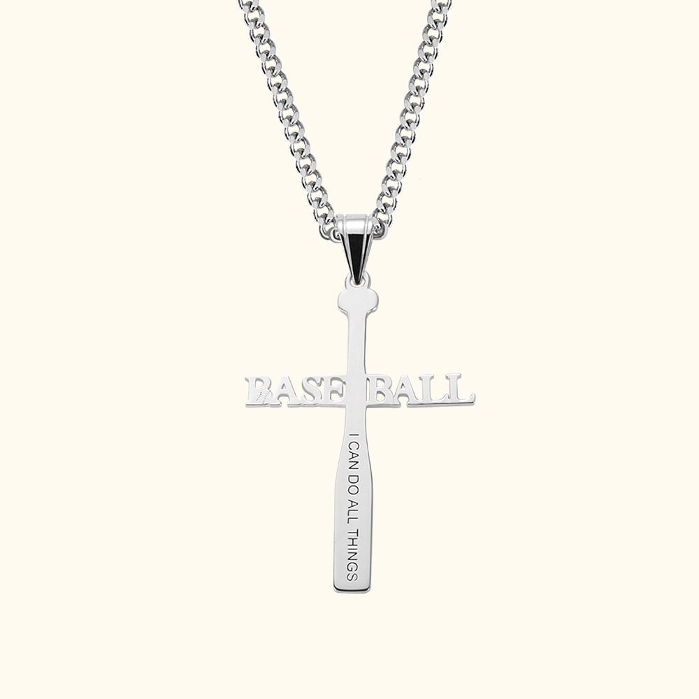 -Disponible en plata y acero inoxidable. Para el color, puede elegir platino, oro u oro rosa, oro negro. Este collar único de la cruz del béisbol con "PUEDO HACER TODAS LAS COSAS" y "Filipenses 4:13". Es un versículo bíblico inspirador, que representa la confianza y el valor de no tener miedo a las dificultades, o puede elegir definir una frase corta, grabar el texto que más le apetezca.