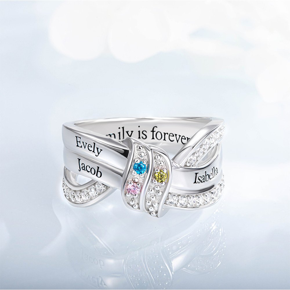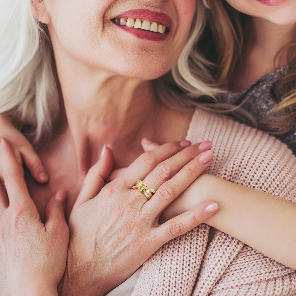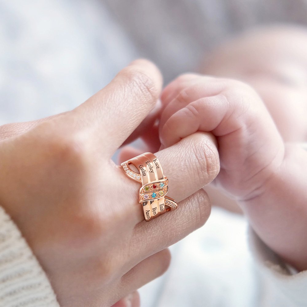 Lo que hace que este anillo sea realmente único es la posibilidad de personalizarlo con 1 a 8 piedras de nacimiento y nombres grabados. Cada piedra de nacimiento representa a un miembro de la familia, lo que le permite personalizar el anillo para incluir las piedras de nacimiento de su madre, abuela, hijos o incluso nietos. Las piedras de nacimiento están cuidadosamente engastadas dentro del nudo de la cinta, añadiendo un toque colorido y vibrante al anillo.