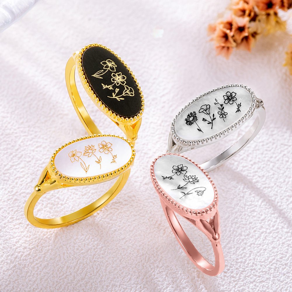Este anillo es el regalo perfecto. Pida uno para mamá para representar a su hijo. O regale un anillo a un ser querido para recordarle que es tan bella como una flor. Se pueden personalizar de 1 a 4 flores en la concha blanca o en el ágata negra.