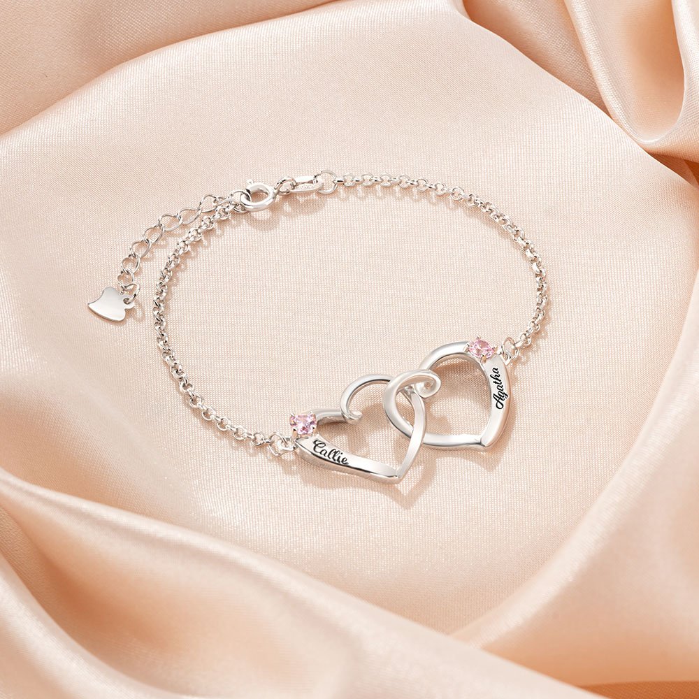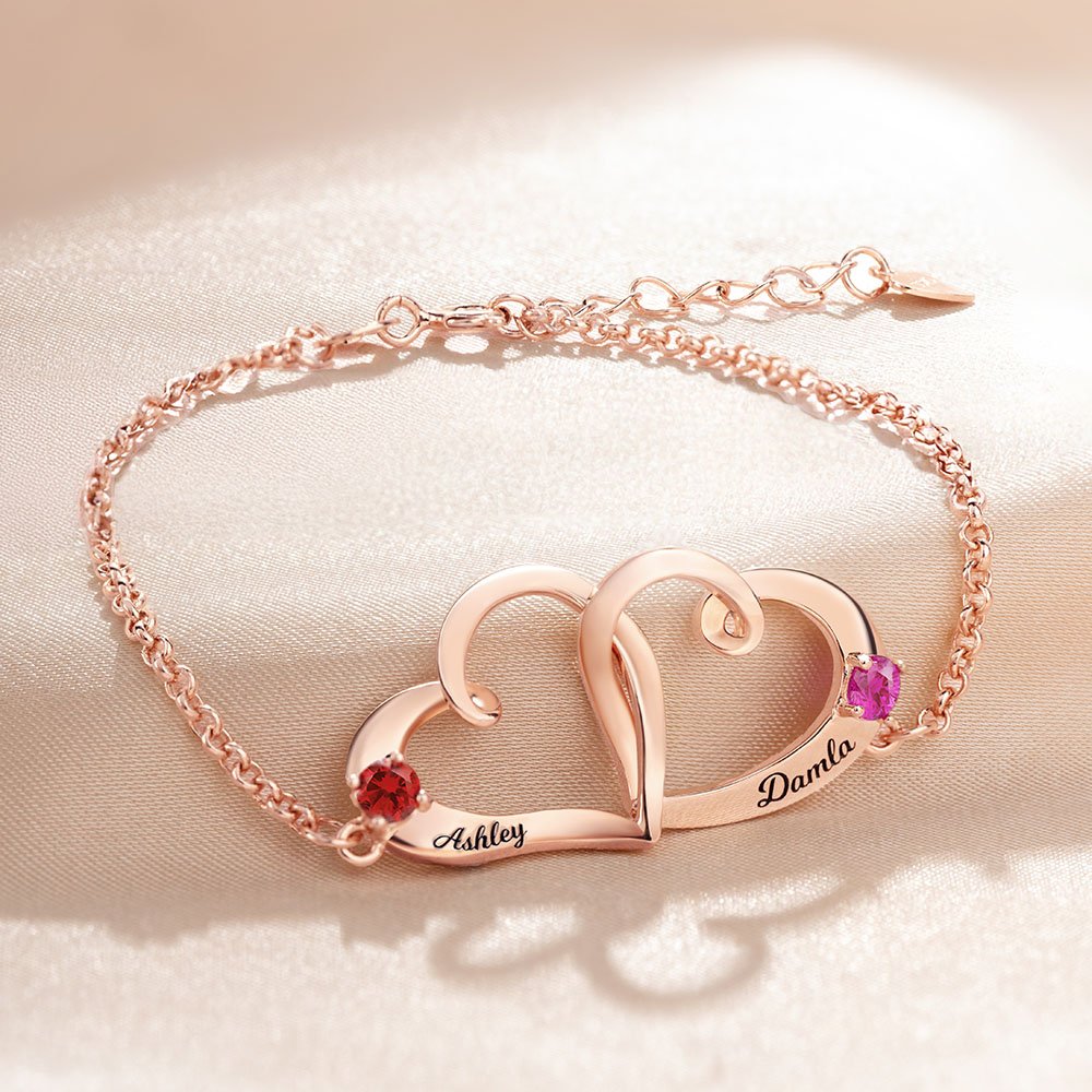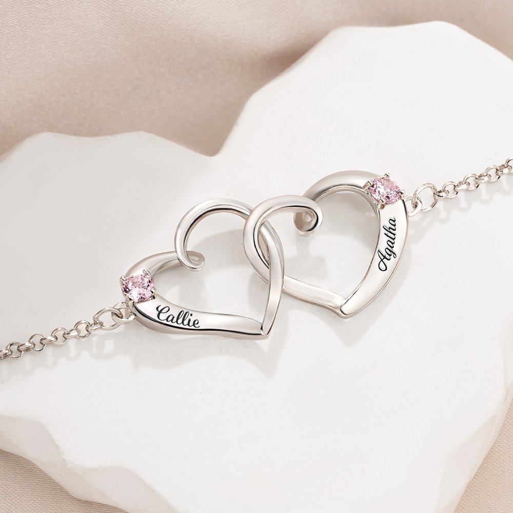 Adornando el lado de cada corazón están las brillantes piedras de nacimiento y los nombres de su elección, añadiendo un toque de colorida elegancia e individualidad. Las piedras de nacimiento crean un espectáculo fascinante que refleja la personalidad única de sus portadores.