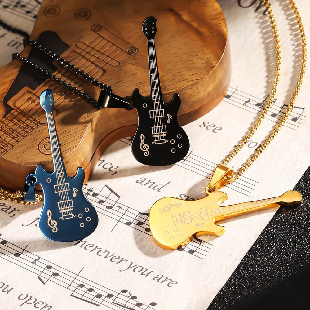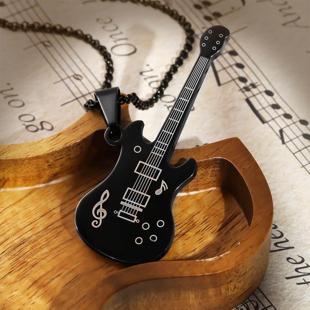 -Cada uno de nosotros lleva una canción dentro, la canción que nos hace humanos. Personaliza tu colgante de guitarra eléctrica grabando tu nombre en la parte posterior del colgante. Super cool diseño de la guitarra con una nota musical y delicadas cuerdas en diferentes colores puede coincidir con todos sus trajes.