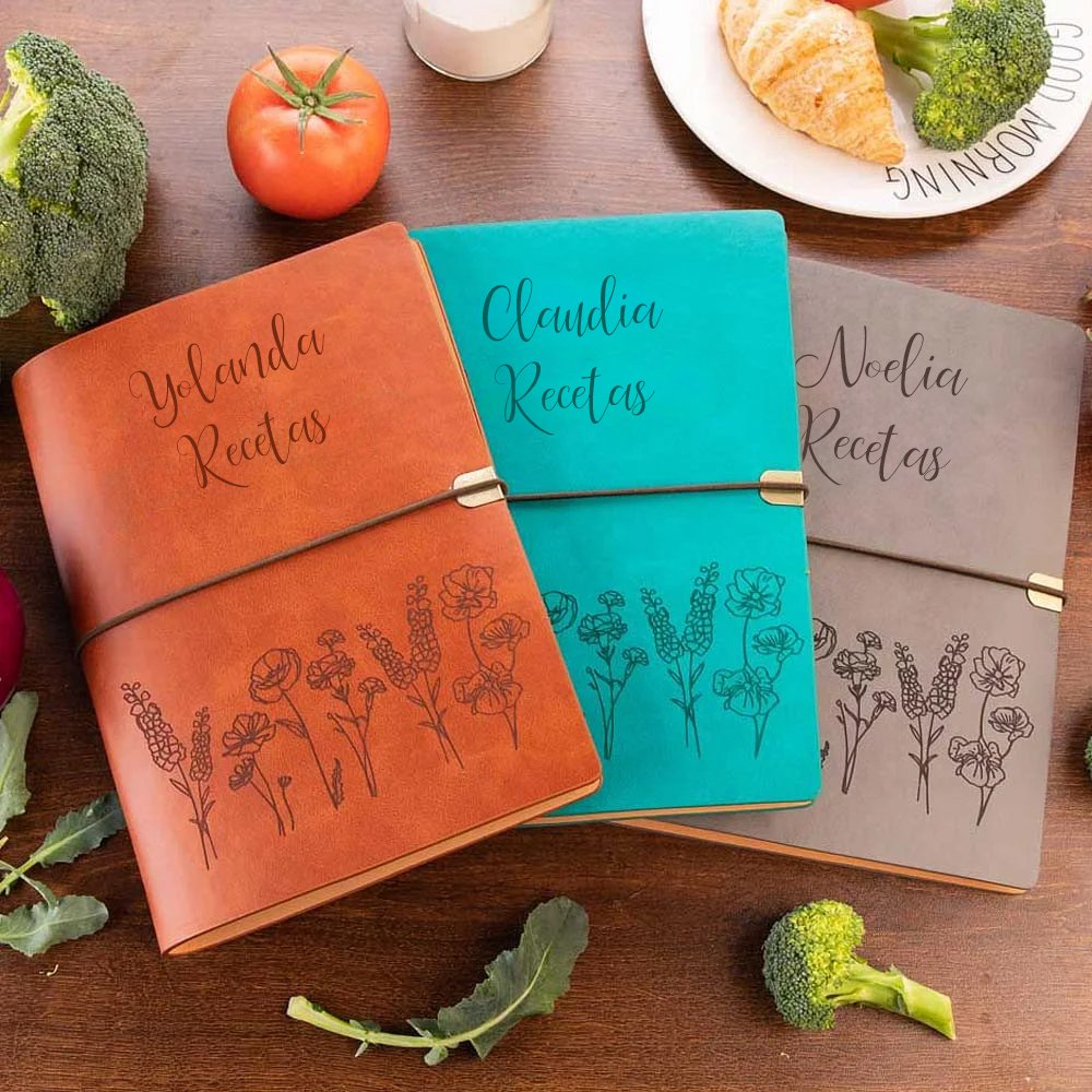 Puedes añadir tu texto favorito y lo grabaremos gratis en la portada de tu receta. Cubierta de cuero flexible con cordón elástico en el centro para evitar que se deshaga. Encuadernación de ferretería con núcleo interior reemplazable. ¡Es el regalo perfecto para cualquiera que ame o esté aprendiendo a cocinar!