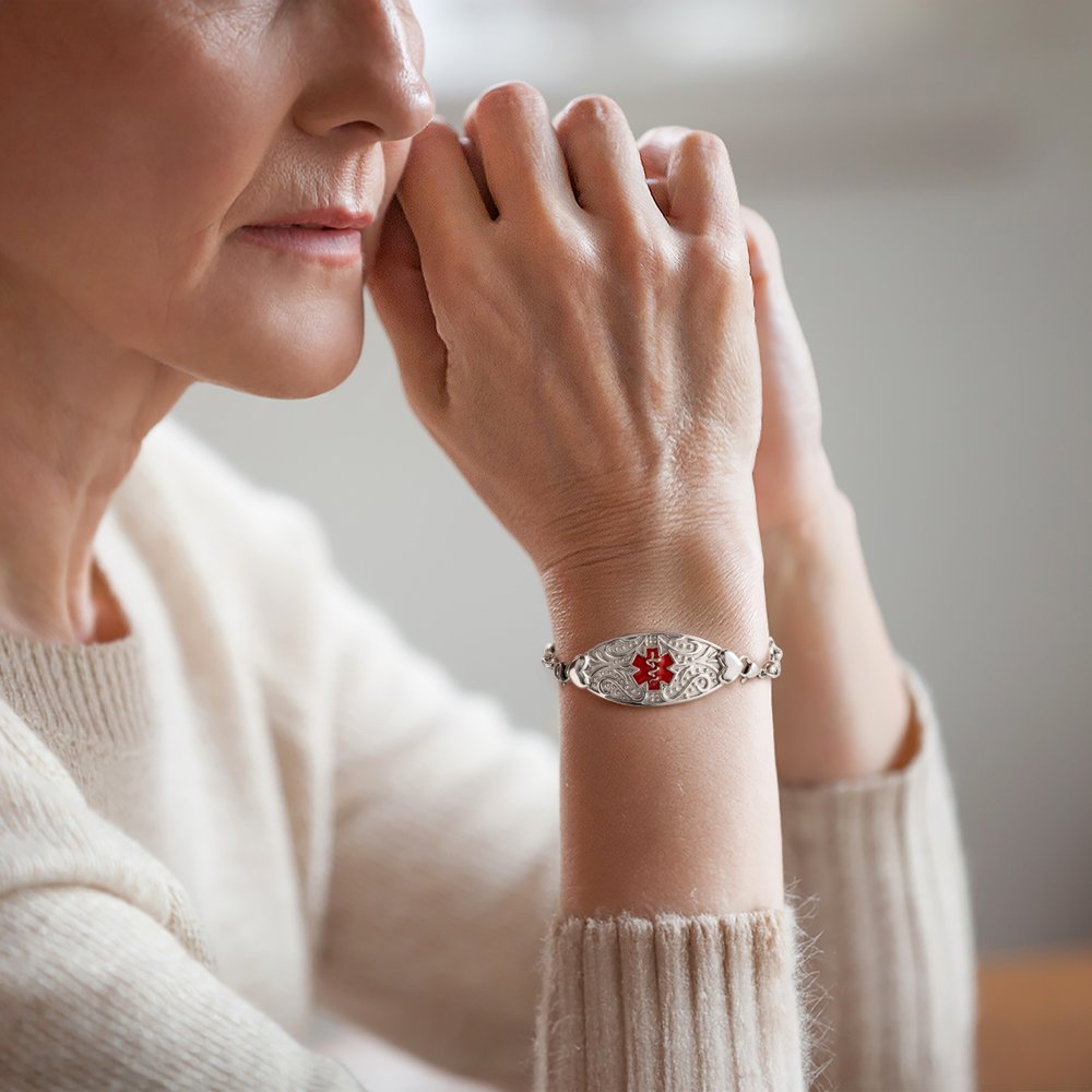 La pulsera médica combina funcionalidad con una estética elegante, lo que la convierte en un accesorio esencial para la mujer. Con un elegante emblema de la Estrella de la Vida, esta pulsera no es solo una declaración de moda, sino también una herramienta crucial de alerta médica.