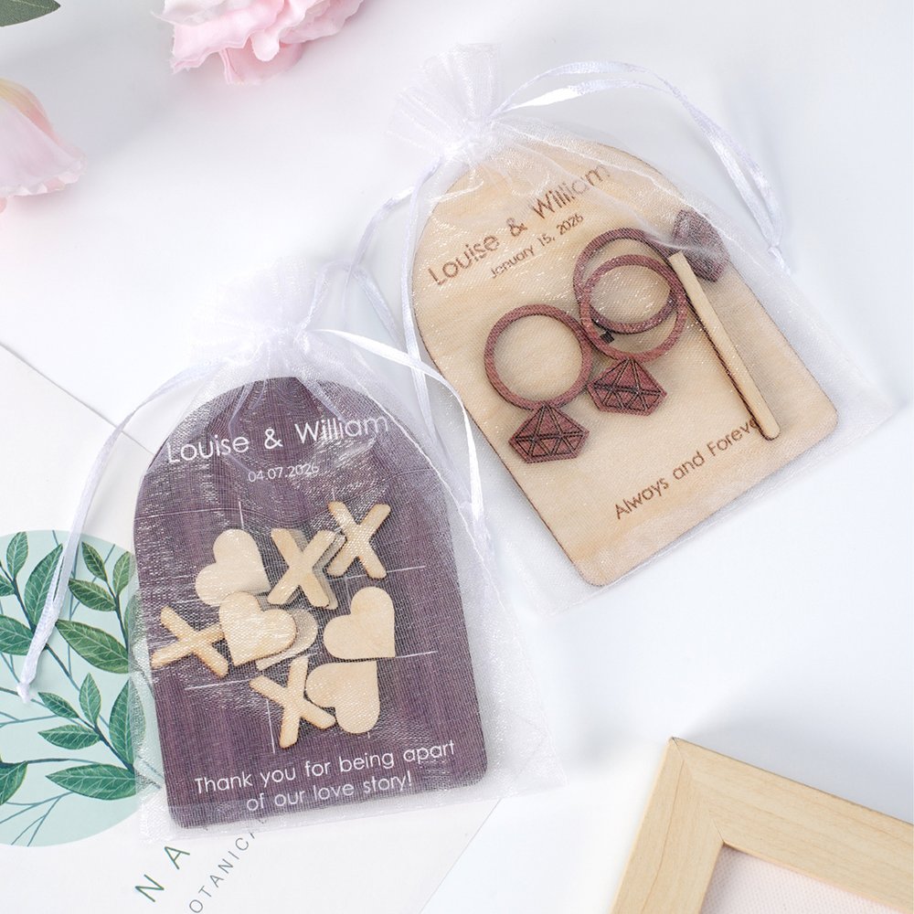 Fabricado con la mejor madera, muestra la belleza de sus vetas naturales al tiempo que garantiza una larga durabilidad. Cada juego de lanzamiento de anillas incluye una base, un palo de madera, cuatro anillas y una bolsa de organza. Cada juego de tres en raya incluye una base, cinco corazones, cinco cruces y una bolsa de organza. Desde la elección de los materiales hasta los accesorios a juego, cada detalle demuestra una meticulosa atención a la calidad.