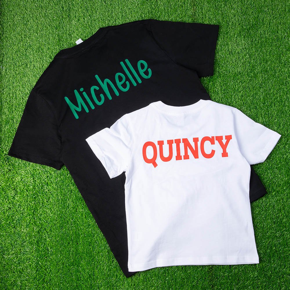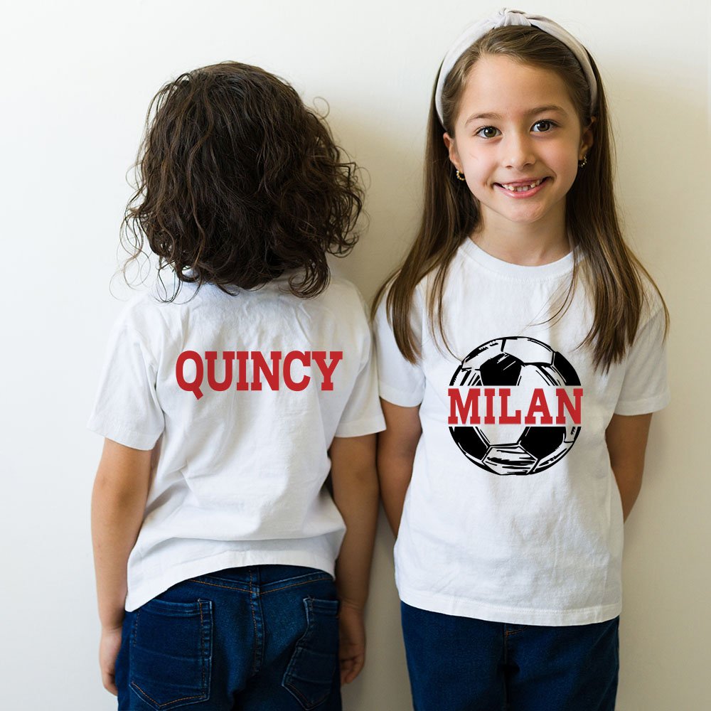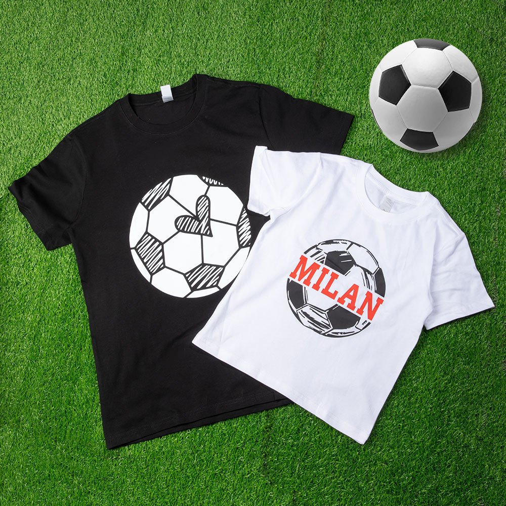 Los estampados de fútbol negros sólo se aplican a las prendas blancas, mientras que los estampados de fútbol blancos se utilizan para todos los demás colores. El nombre de la camiseta se personaliza en la espalda y el de la sudadera, en la manga.