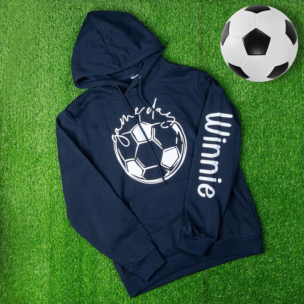 Sudadera con capucha de fútbol con un interesante diseño en la parte delantera, nombre personalizado en la manga, y el color del nombre puede elegir su color favorito o el color del equipo de apoyo. Aumentar la atmósfera en los juegos de los niños y la práctica del juego de pelota, aumentar la moral, y unificar el estilo del equipo o equipo de apoyo.