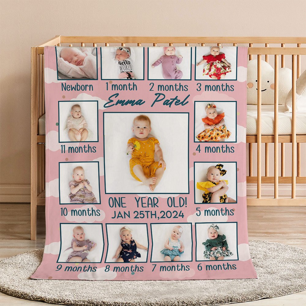 Personalizado 1-12 meses bebé fotos suave manta con nombre y fecha decoración de la habitación regalo de cumpleaños para el bebé