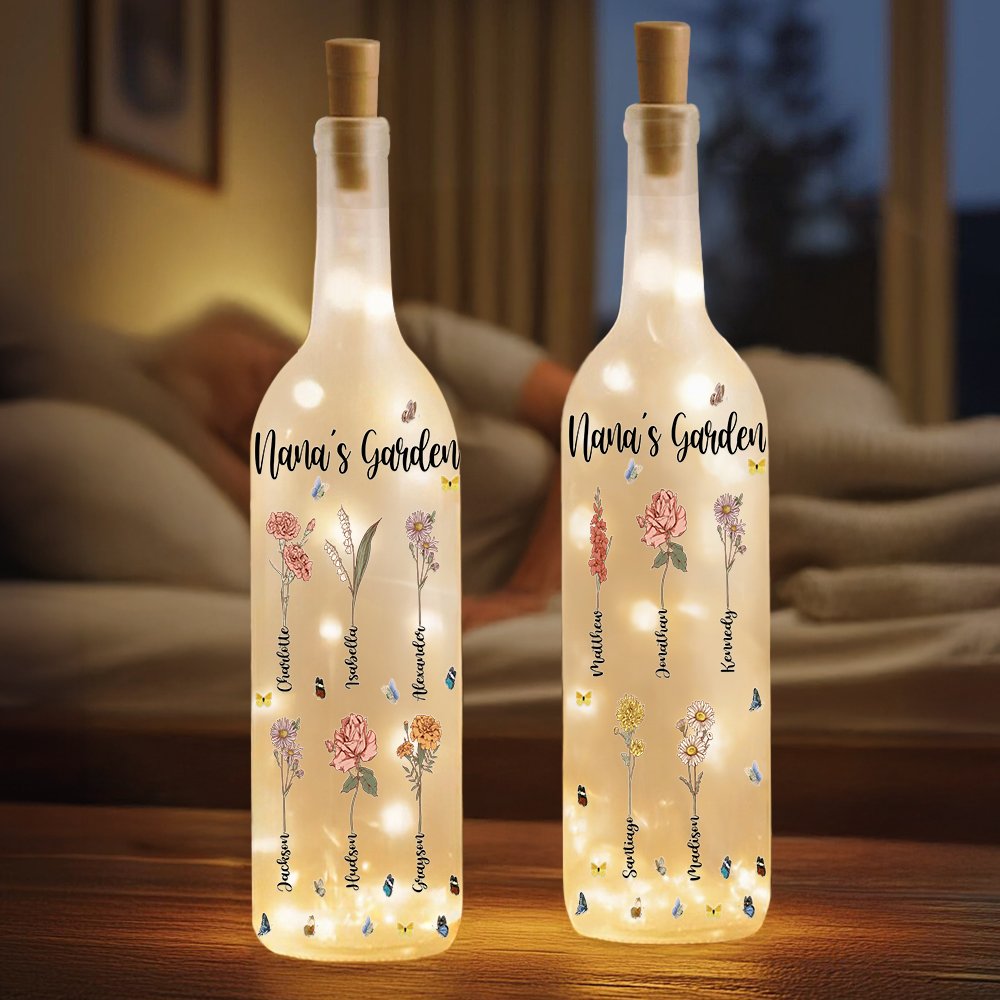 Esta encantadora lámpara de botella cuenta con flores de nacimiento y nombres personalizados del 1 al 18; puedes introducir el título, "jardín de mamá, jardín de la abuela," convirtiéndola en una pieza memorable para cualquier hogar. Celebra momentos especiales con un diseño que refleja la belleza de la naturaleza y la conexión personal.