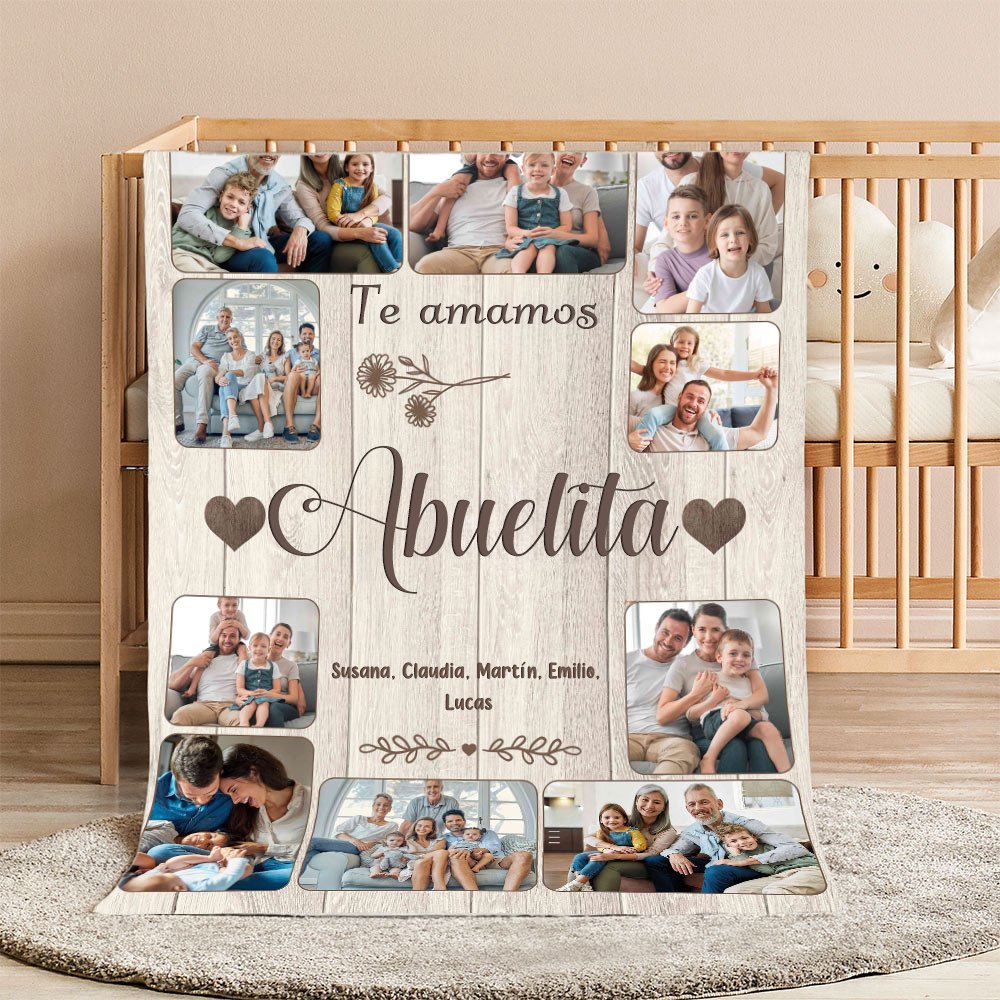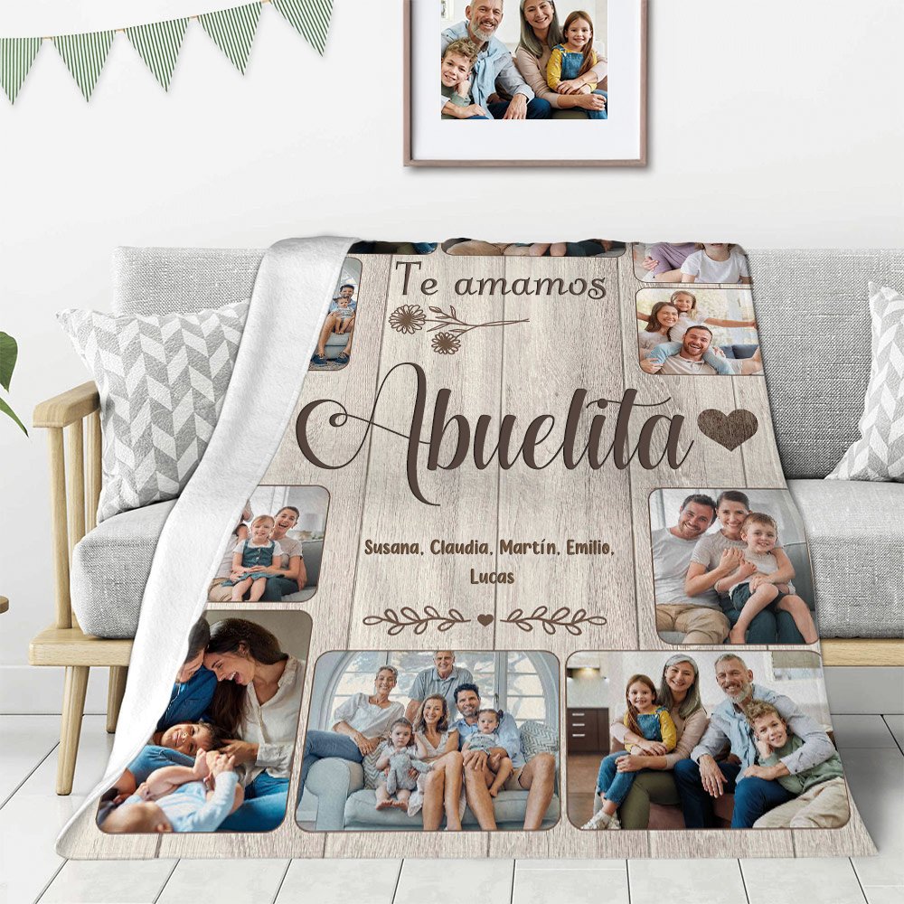 Celebra el profundo y entrañable vínculo entre generaciones con la manta. Sube hasta 10 fotos familiares y de 1 a 8 nombres para crear un emotivo collage. Cada imagen cosida en esta manta se convierte en un recordatorio de recuerdos inolvidables y del calor de la familia.