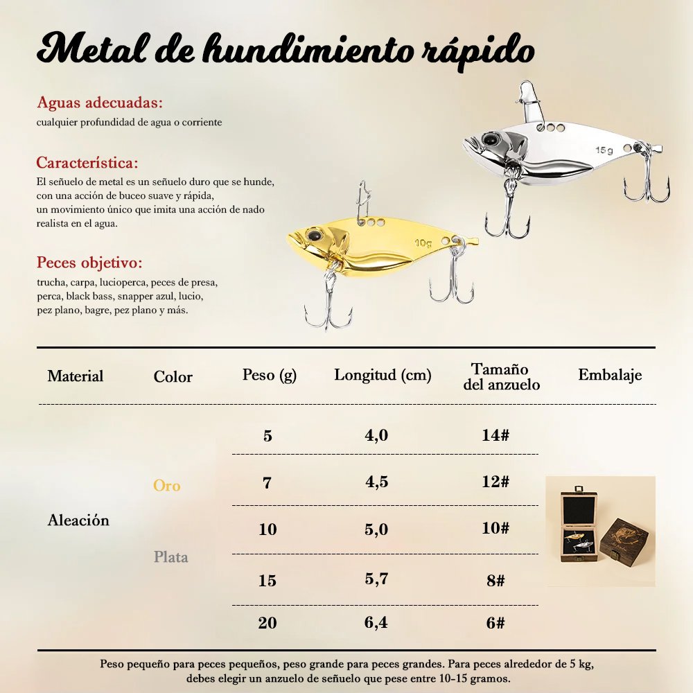 Este señuelo biónico es muy tridimensional como un señuelo de pez real. Un juego incluye una caja de madera texturizada vintage con un patrón de pesca fijo y palabras personalizables grabadas en la parte frontal y dos señuelos dentro uno dorado y uno plateado con 5 tipos de pesos a elegir adecuados para pescar en diversas situaciones. El acabado metálico y el diseño realista hacen que estos señuelos se destaquen y ofrezcan a los pescadores una experiencia de pesca emocionante.
