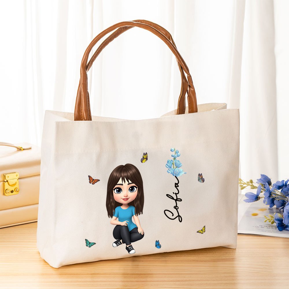 Nuestro bolso tote presenta un personaje de dibujos animados en 3D que puedes personalizarlo según tu imagen en la parte delantera. También puedes personalizarlo con tu flor de nacimiento y nombre para mostrar la personalidad única.