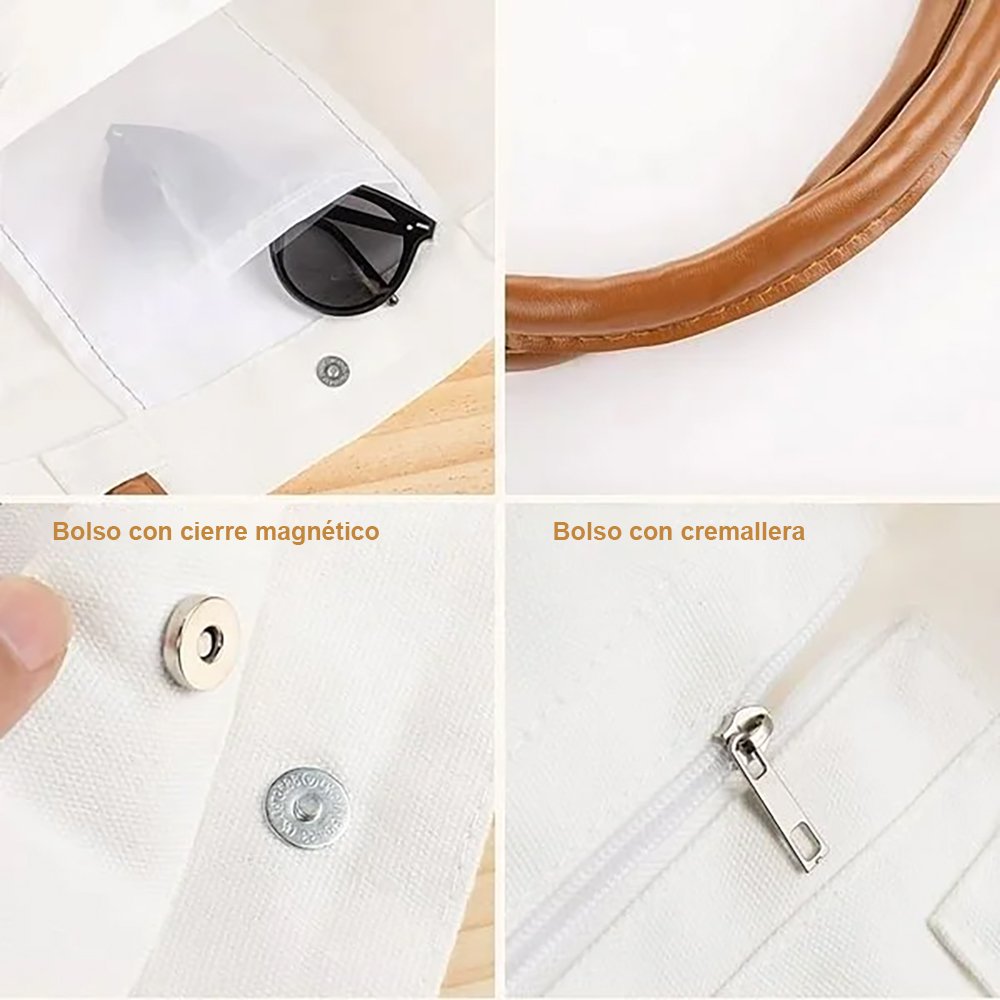 Fabricada en lona de alta calidad, es suave al tacto y duradero, lo que garantiza que no se desgaste con facilidad durante mucho tiempo. El diseño del asa de cuero no solo realza la sensación general de gran clase, sino que también aumenta la comodidad de llevarlo en mano. Cada detalle está cuidadosamente elaborado, lo que refleja el alto nivel de los estándares de calidad.