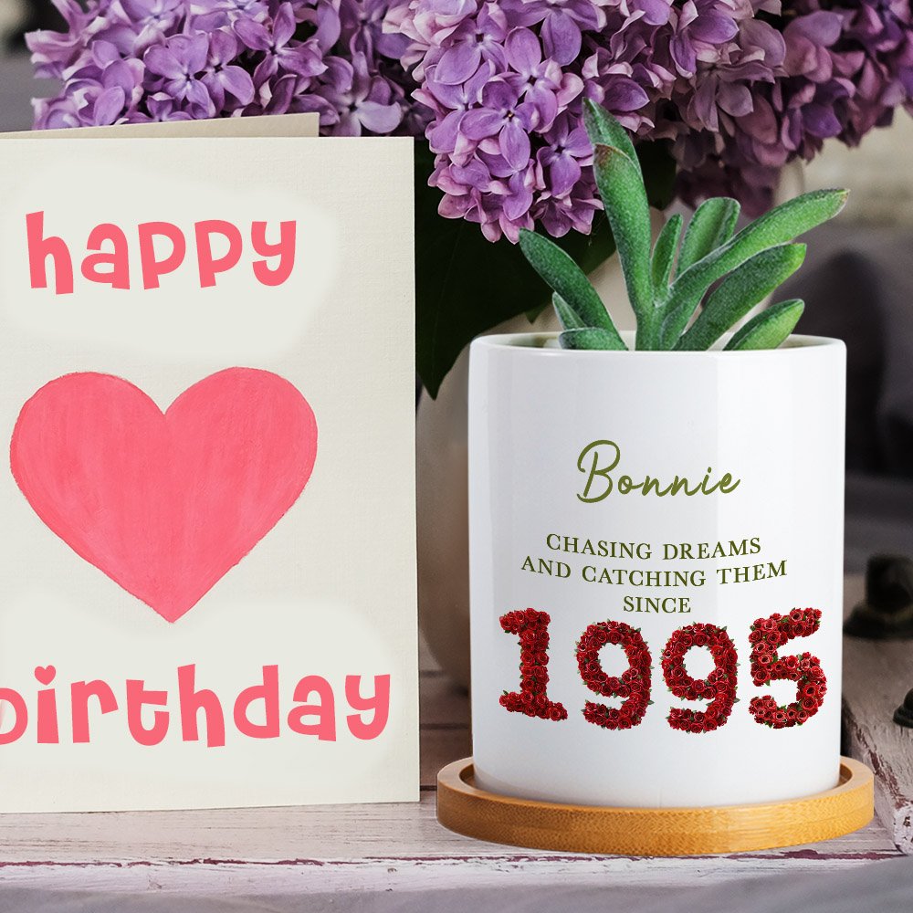 Elaborada con esmero, esta maceta lleva la belleza de la naturaleza al interior. Esta maceta tiene un texto personalizable en la parte delantera para destacar un logro personal o transmitir un mensaje positivo. Va acompañada de un número especial del año de cumpleaños que puedes personalizar. Hay cuatro diseños disponibles: rosas rojas, rosas rosas y blancas, plumas rosas y suculentas verdes, que simbolizan la belleza, el esplendor y el florecer de la vida.