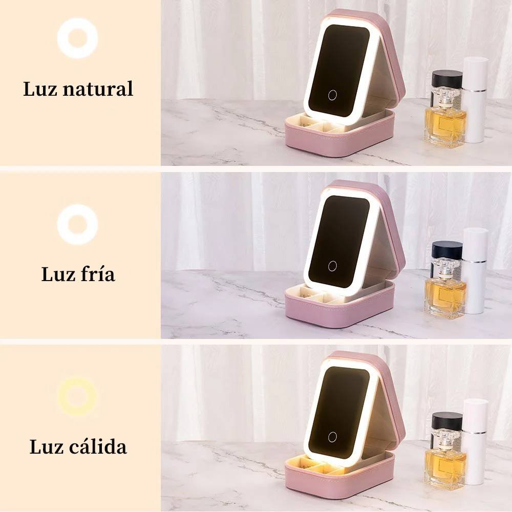 El joyero es una fina combinación de cuero PU, que te da un tacto suave y liso, proporcionando una sensación cómoda al manipularlo. Está equipado con una suave iluminación LED y ofrece tres configuraciones de color ajustables: luz cálida, luz natural y luz fría. Esto permite adaptarse a diferentes escenarios de uso, ya sea una tranquila noche en el tocador o una apresurada rutina matutina.