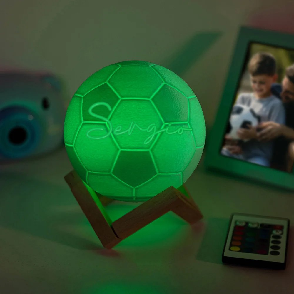 Diseñada para ti como aficionado al fútbol, esta luz nocturna con forma de balón es a la vez práctica y artística. Su diseño elegante y dinámico da un toque a tu habitación, convirtiéndola en la pieza decorativa perfecta. Cuentas con un diseño sensible al tacto que te permite encenderla o cambiarla a otros colores con solo tocarla, y también viene con un mando a distancia para que la controles a distancia, lo que añade un elemento divertido e interactivo al diseño. No solo está disponible en tres tamaños, sino que también puedes elegir personalizarla con tu nombre, convirtiéndola en una pieza única.