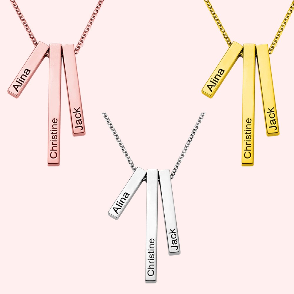 -El collar de estilo industrial y moderno de Callie transmite el significado de confianza e individualidad. Los cortes de las barras refractan la luz entrante de forma brillante. Este delicado collar muestra tres barras estereoscópicas de diferentes longitudes. El diseño sencillo pero elegante de las barras indica el significado de tres palabras o nombres especiales para quien lo lleva. A las chicas les encantará, ya que se adapta sin esfuerzo a todo tipo de ocasiones sin dejar de ser único.