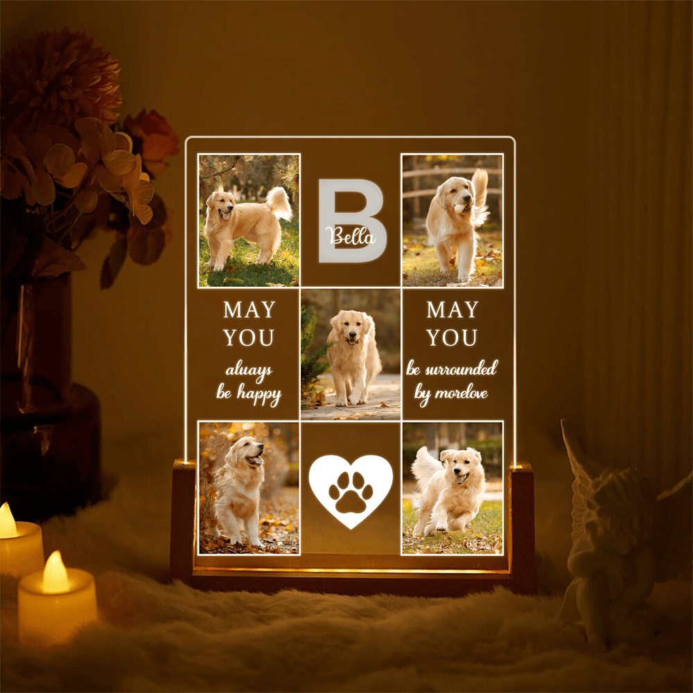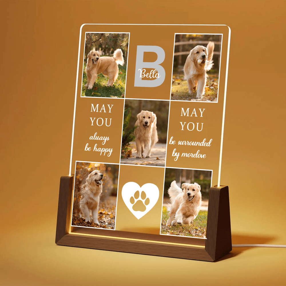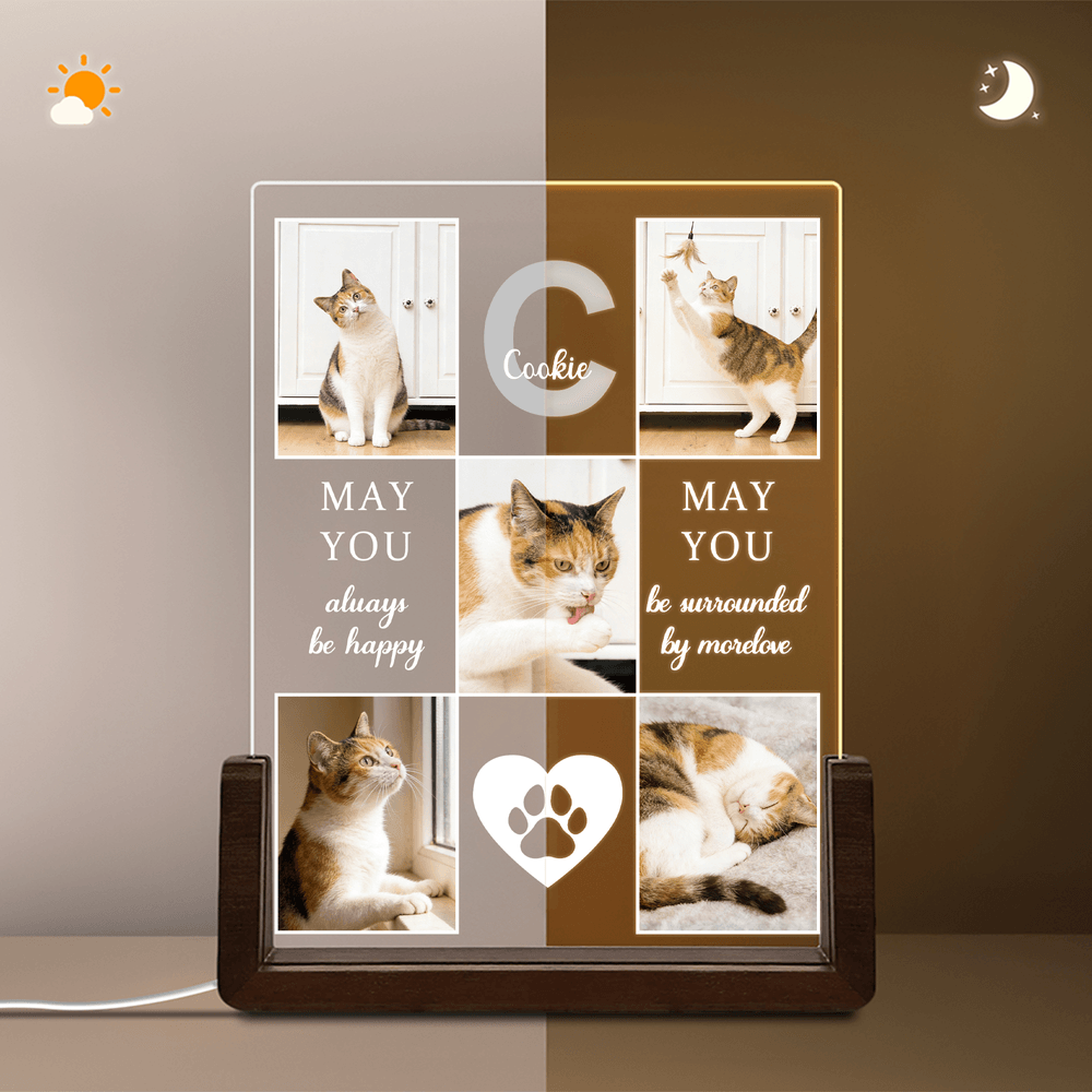 Esta luz nocturna presenta un diseño de collage personalizable: puedes subir hasta 5 fotos de tu querida mascota, junto con su nombre, un motivo de huella de pata y mensajes cariñosos como "Que siempre seas feliz". Convierte una luz funcional en un tributo sentimental, capturando los momentos únicos de tu mascota y tu profundo vínculo con ella.