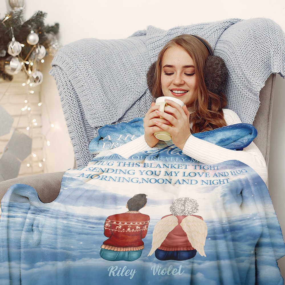 El mensaje "Un abrazo desde el cielo cuando realmente me echas de menos abraza esta manta fuerte te estoy enviando mi amor y abrazo mañana,mediodía y noche/Abrazos desde el cielo cuando realmente nos echas de menos abraza esta manta fuerte te estoy enviando nuestro amor y abrazos mañana,mediodía y noche" está bellamente impreso en la manta, recordando a la gente a recordar siempre a los seres queridos que han muerto.