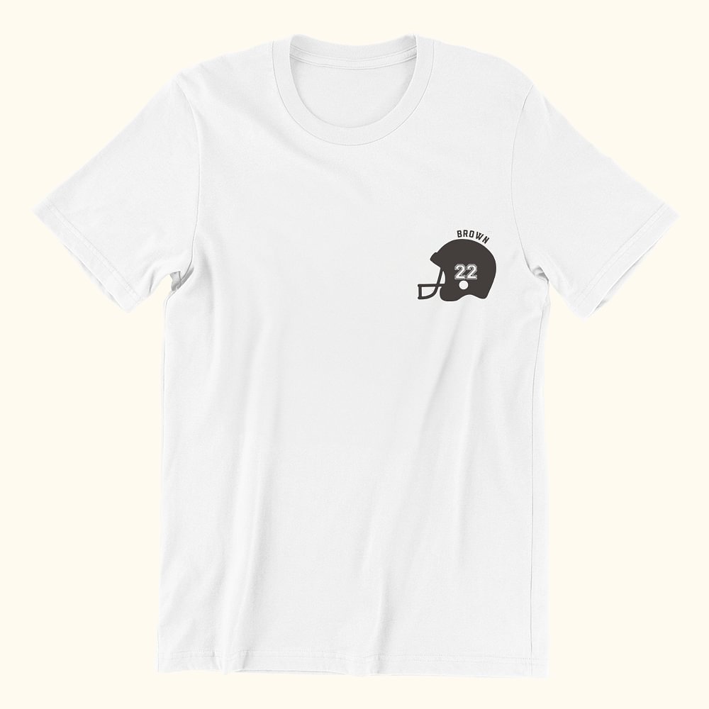 El pecho izquierdo de esta camiseta o sudadera imprime un elegante diseño de casco de fútbol americano y la parte trasera se puede personalizar con el nombre del destinatario y el número de jugador exclusivo, lo que hace que la prenda sea realmente especial y única.