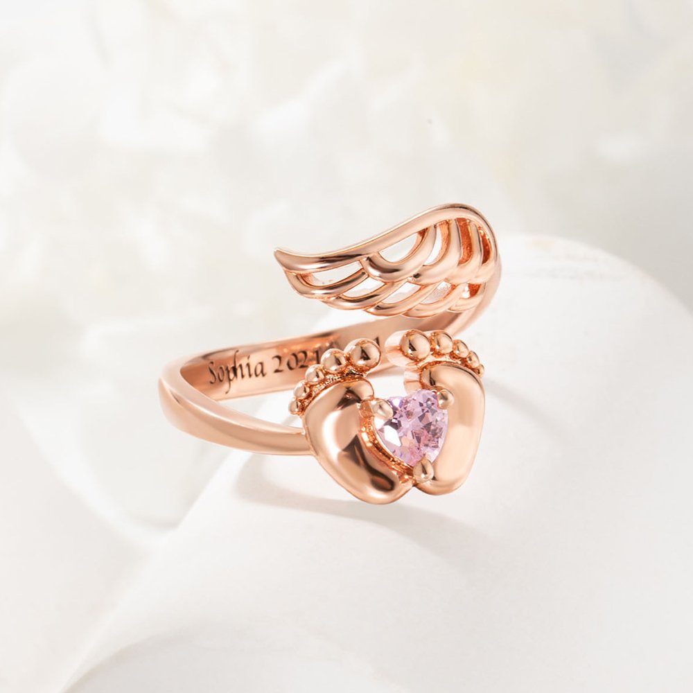 El anillo conmemorativo está diseñado con alas de ángel y huellas de bebé con corazón, lo que expresa el deseo de la madre de que el bebé nonato se convierta en un ángel y permanezca en sus corazones.