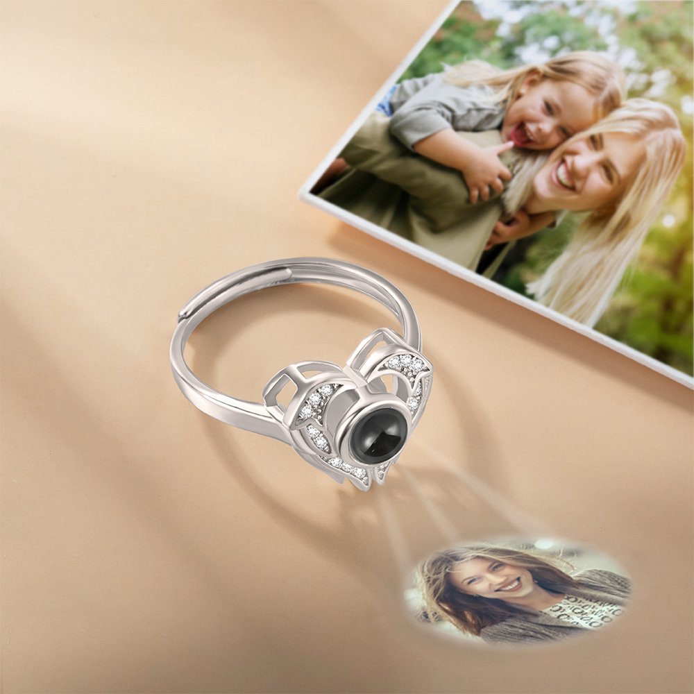 Con el contorno de un corazón y las alas de un ángel, este anillo de proyección transmite el amor en 100 idiomas, que se muestran en la proyección central, de una manera sencilla pero significativa. Un corazón brillante y resplandeciente adornado con un conjunto de cristales ofrece los rasgos delicados y delicados del anillo. Abra la aplicación linterna del teléfono móvil y acerque la cara posterior del anillo a ella para ver "Te quiero" escrito en 100 idiomas diferentes.