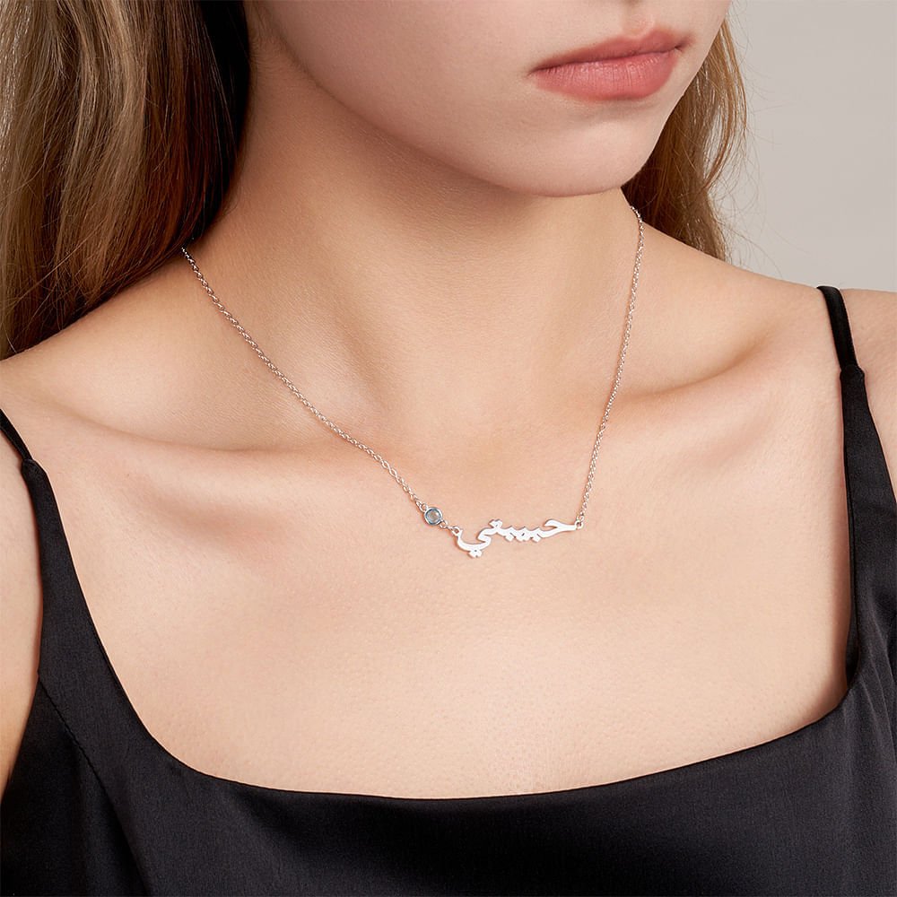 Este collar es un regalo hermoso y significativo. El colgante está personalizado con el nombre en caligrafía árabe y diseñado para dar al portador un sentido de pertenencia a su propia etnia y ascendencia al llevar un collar en su lengua materna.