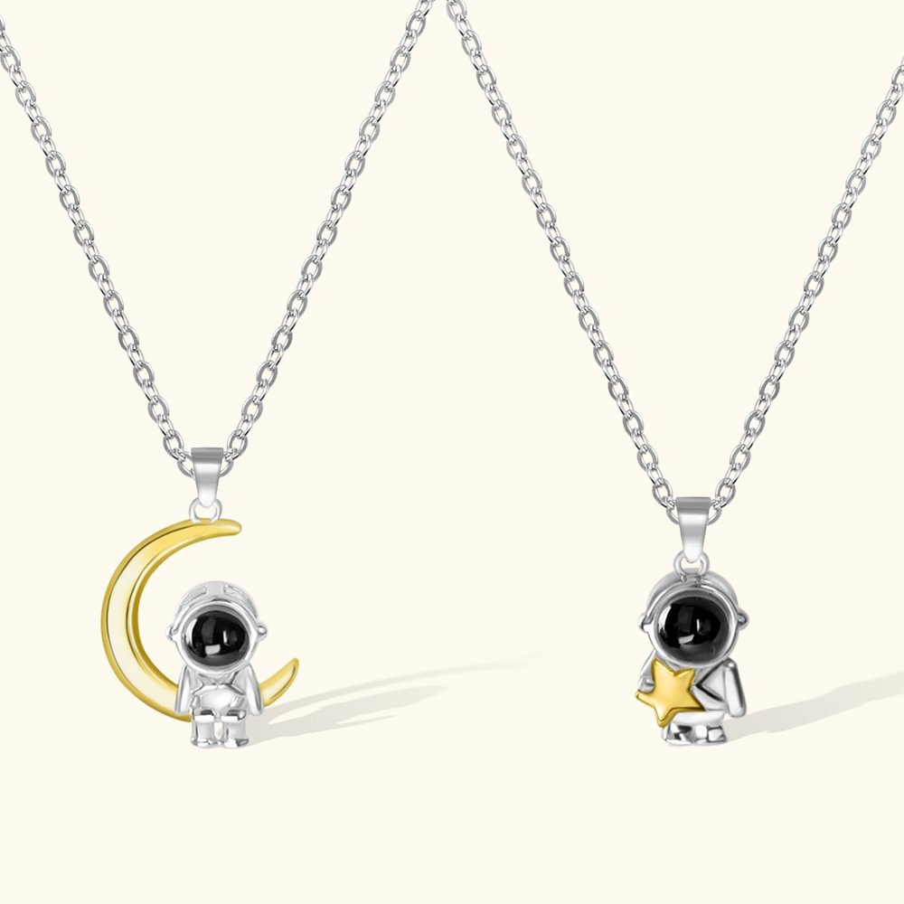 Este collar de proyección no es una pieza de joyería corriente. Presenta un diseño de astronauta con una luna o una estrella, perfecto para cualquiera que ame los misterios del universo.