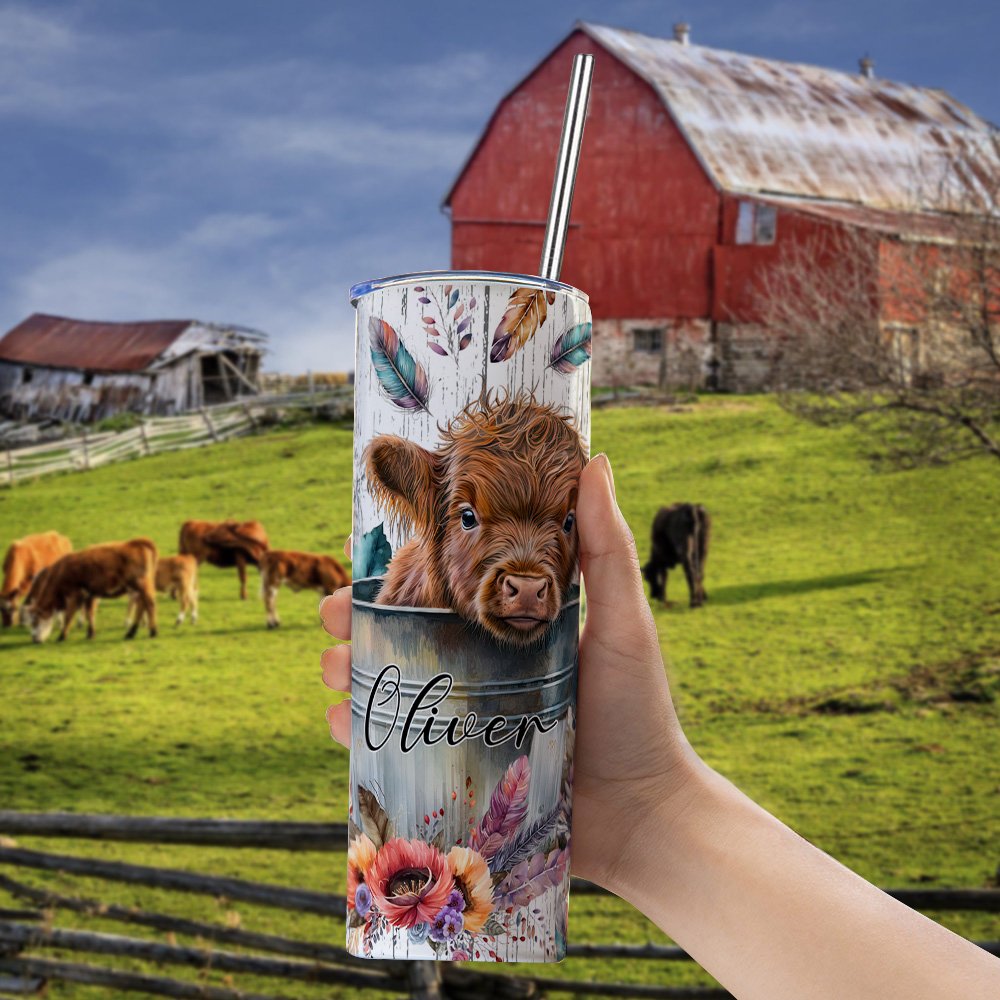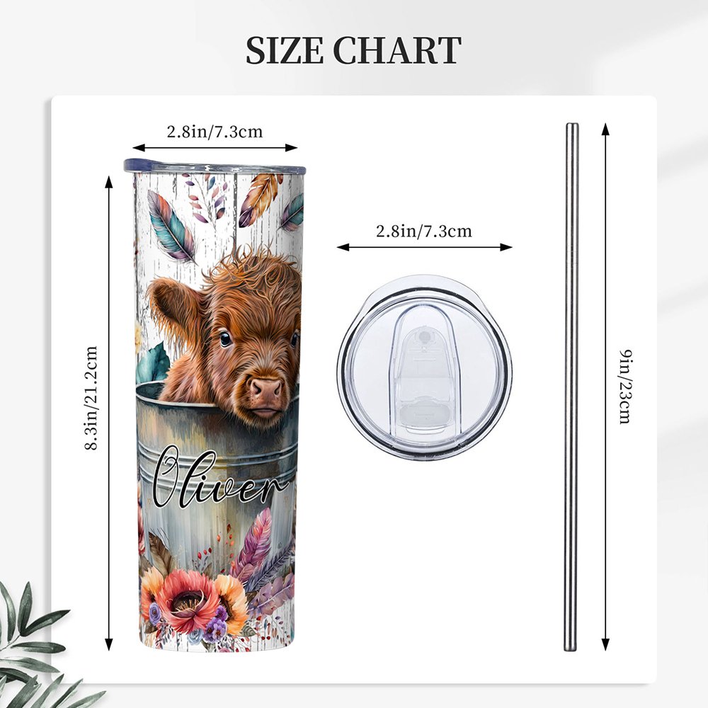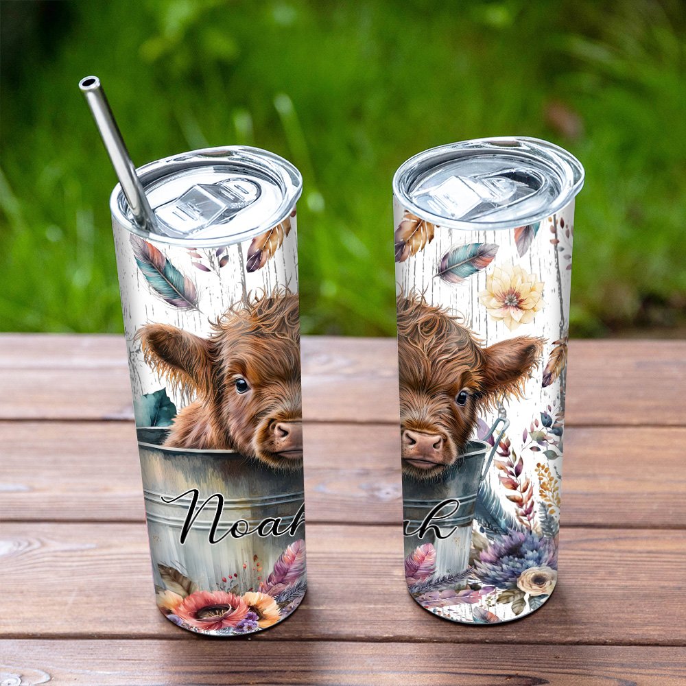 Nuestro vaso delgado imprime la imagen de una linda vaca de las tierras altas bebé en un cubo con un nombre personalizado, lo que hace que se destaque de los vasos térmicos ordinarios y asombre a todos los amantes de las vacas de las tierras altas.