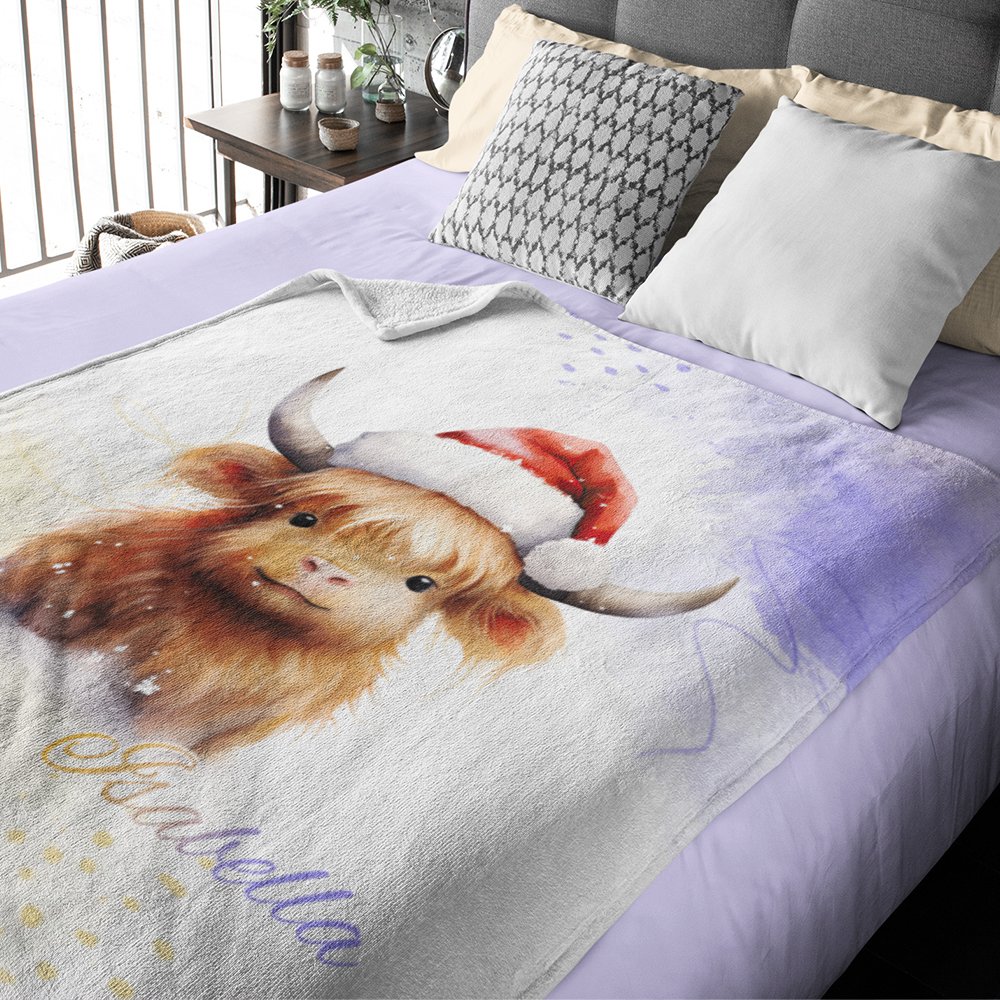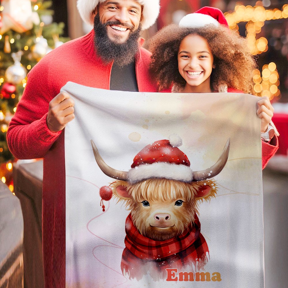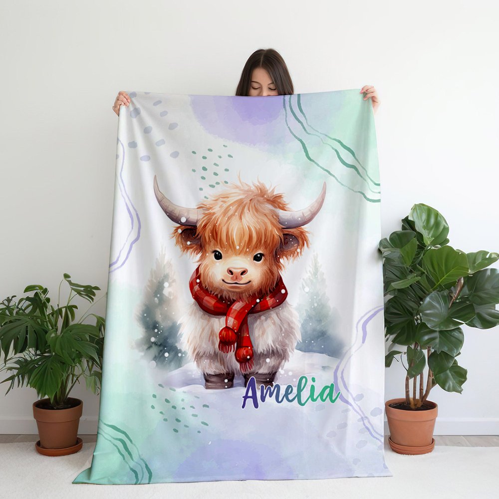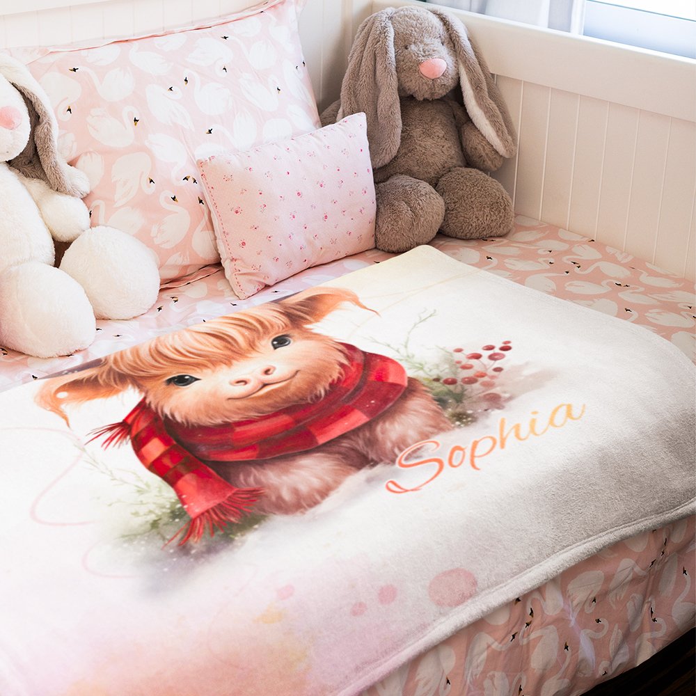 Esta manta de franela de vaca de las tierras altas personalizada es un regalo realmente único. Con la opción de añadir un nombre, se convierte en un recuerdo especial que será atesorado durante años. La adorable vaca montañesa añade un toque de ternura y calidez a la decoración de cualquier habitación infantil o dormitorio.