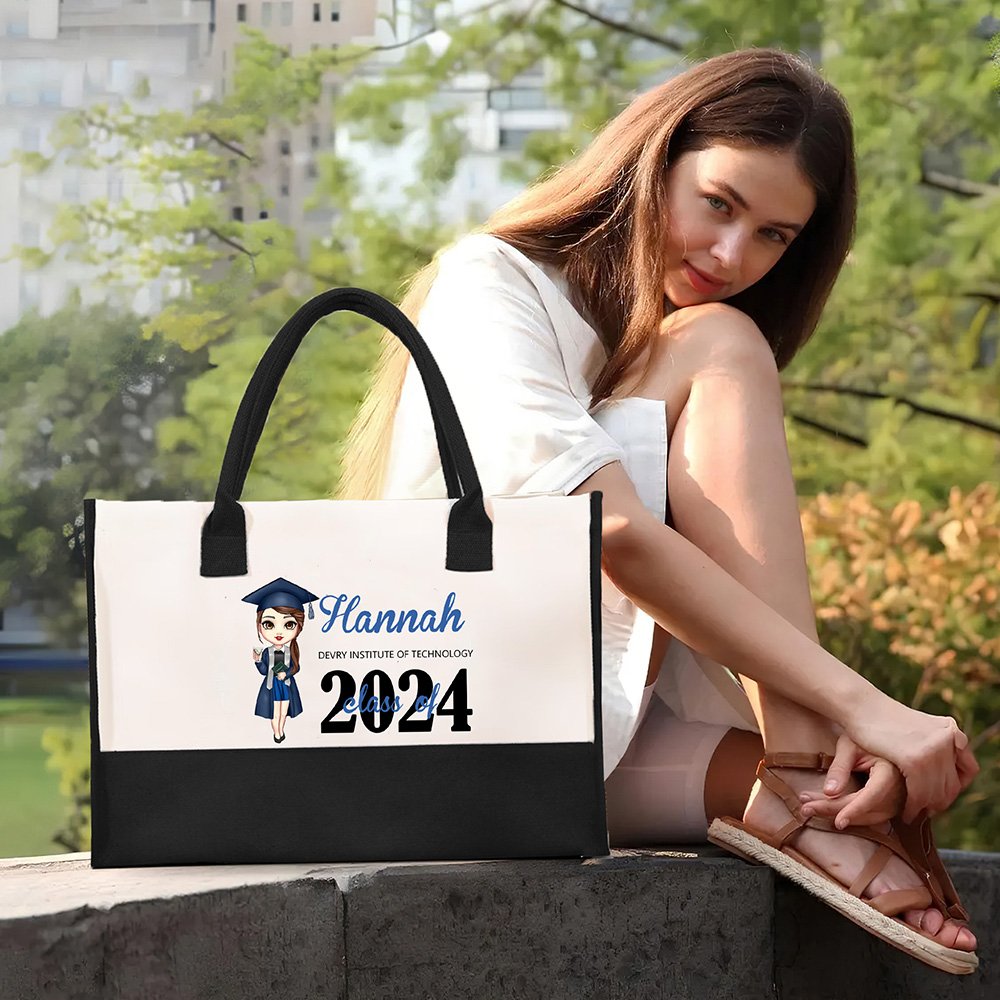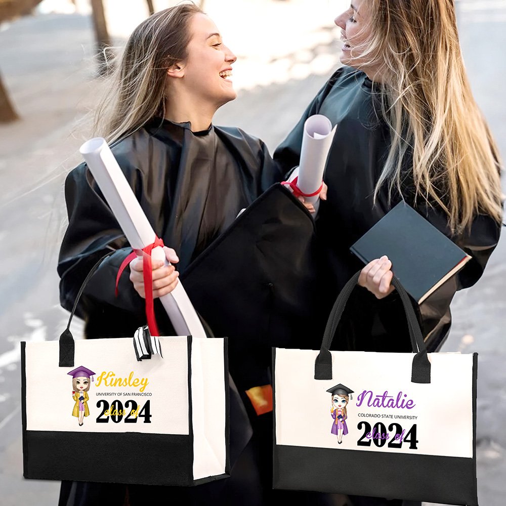 Lo que hace único a este bolso son sus opciones de personalización. Este bolso único presenta un personaje de dibujos animados de la temporada de graduación que puede personalizarse con diferentes peinados, ropa y expresiones para que se acerque más a su verdadera imagen. Este detalle convierte un simple bolso en un preciado recuerdo.