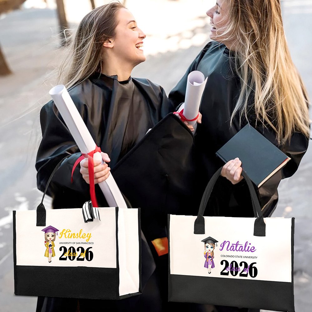 Lo que hace único a este bolso son sus opciones de personalización. Este bolso único presenta un personaje de dibujos animados de la temporada de graduación que puede personalizarse con diferentes peinados, ropa y expresiones para que se acerque más a su verdadera imagen. Este detalle convierte un simple bolso en un preciado recuerdo.