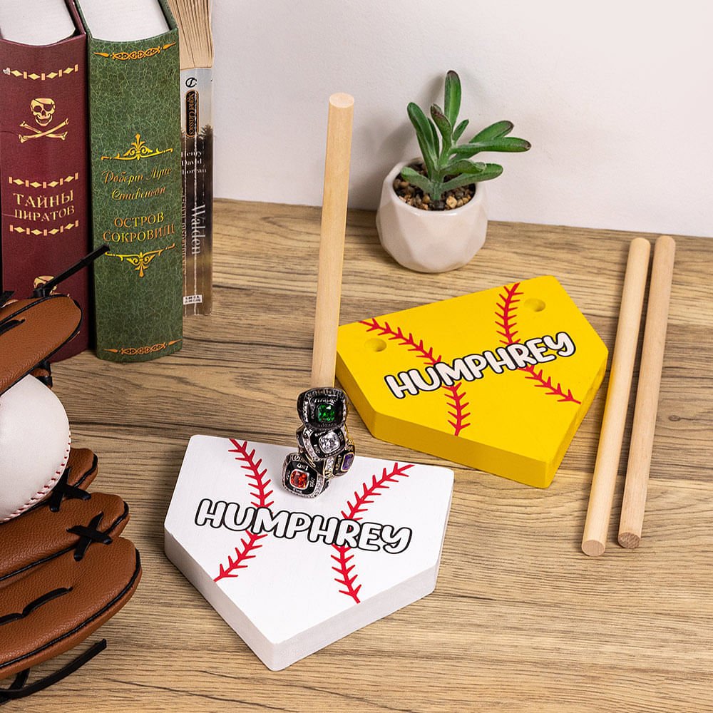 Nuestro porta anillos tiene un diseño elegante y sofisticado. Base seis diseños de bolas para elegir, béisbol, softball, baloncesto, voleibol, fútbol americano y fútbol. Se puede personalizar con nombres y números. Le permite mostrar con orgullo sus premios ganados con esfuerzo y hacerlos brillar.