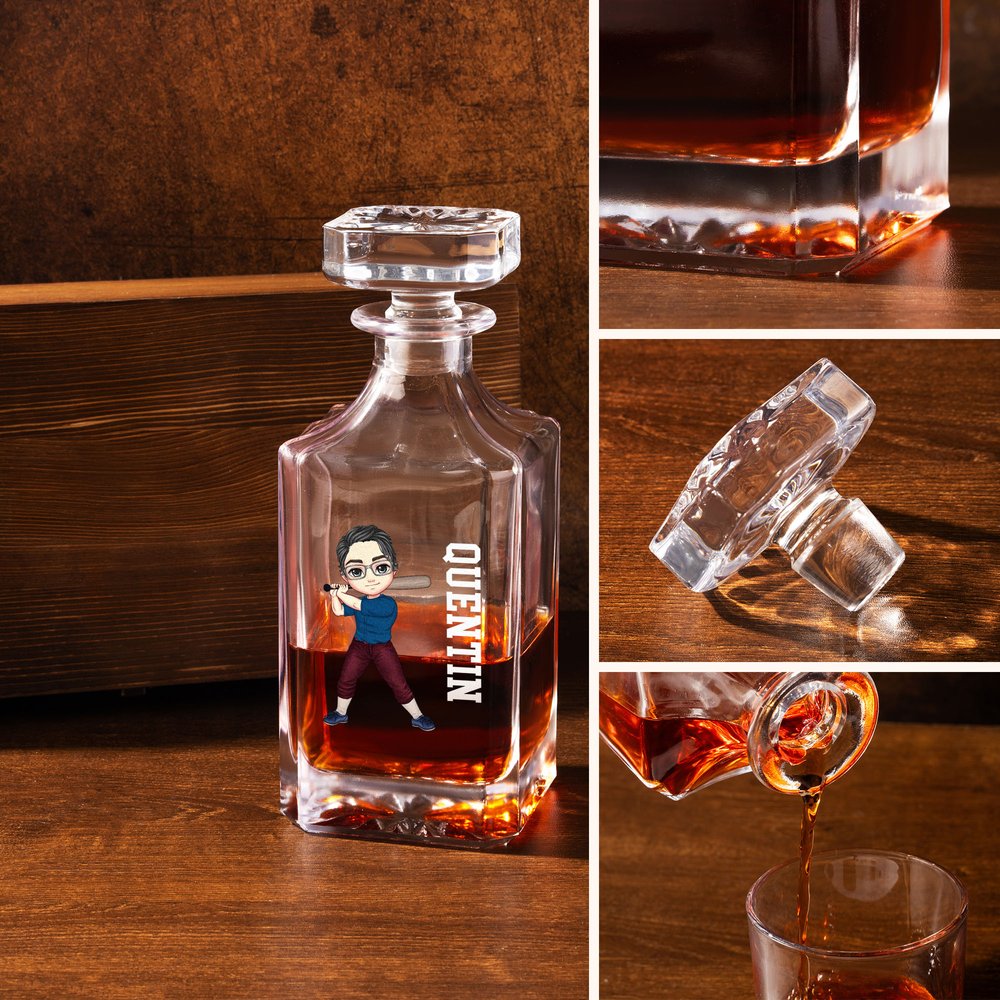 El decantador presenta una silueta elegante y minimalista con un tapón de cristal pulido. La parte frontal muestra un jugador de béisbol de dibujos animados y su nombre en letras limpias y atrevidas, creando un aspecto divertido y sofisticado que celebra tanto el deporte como los licores.