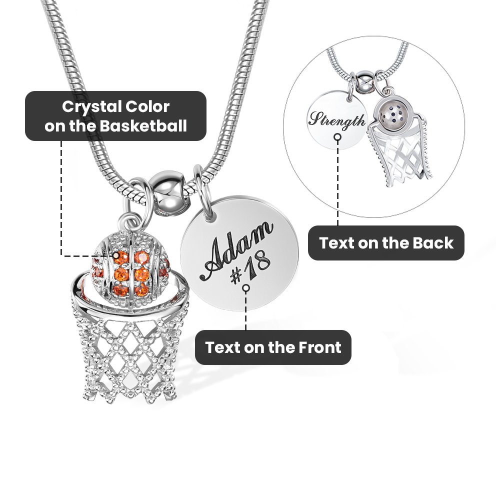 Eleva tu estilo con nuestro collar con nombre colgante de baloncesto personalizado, un accesorio imprescindible para los entusiastas del baloncesto y los jugadores por igual. Esta pieza única cuenta con una pelota de baloncesto y un aro realistas, y puedes elegir entre 13 vibrantes colores de cristal para combinar a la perfección con tu estética. Además, el colgante está cuidadosamente grabado con tu nombre, lo que lo convierte en un complemento único para tu colección de joyas.