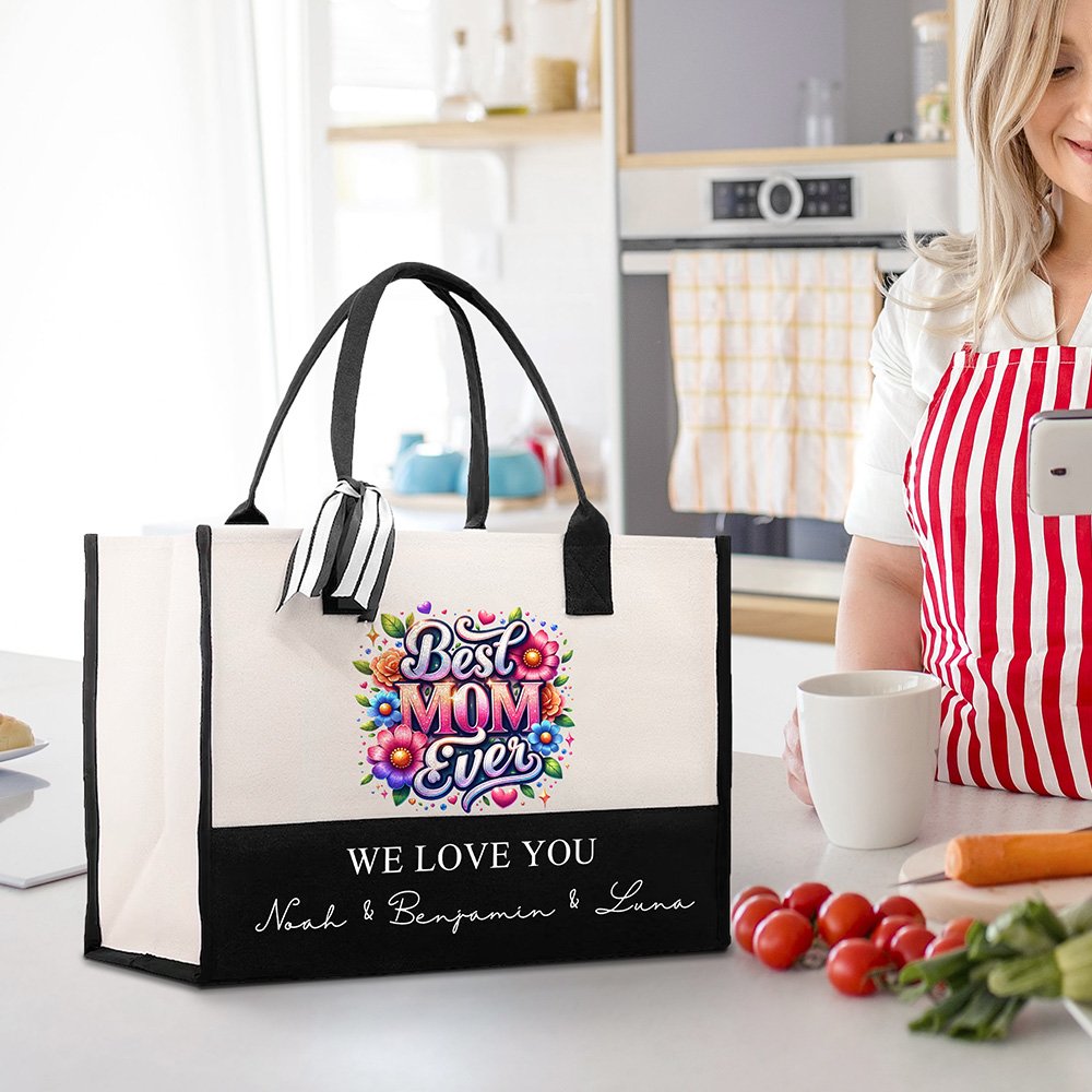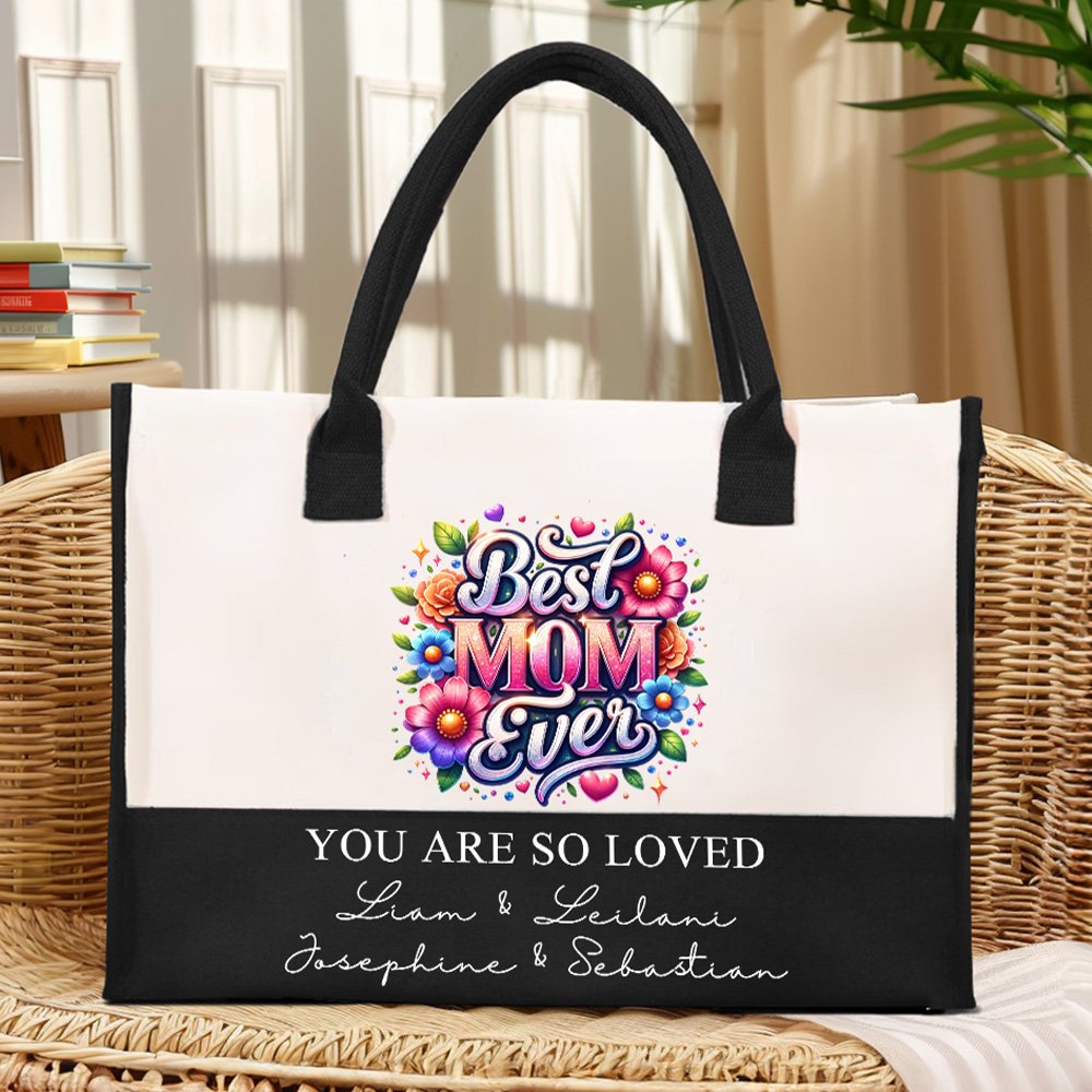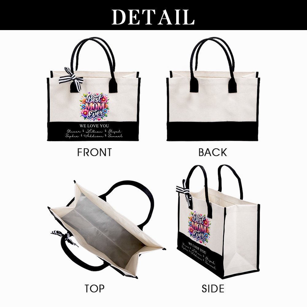 Este elegante bolso de mano presenta un diseño único con colores vivos y frescos, y el eslogan "Best Mom Ever" se combina con elementos florales, llenos de vitalidad. Puedes añadirle de 1 a 6 nombres, añadiendo un toque de intimidad, convirtiéndola en un precioso recuerdo que refleja los sentimientos inseparables entre madre y familia.