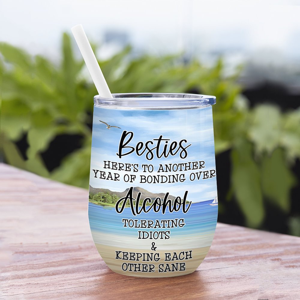 Vaso de Vino Reutilizable con Tapa y Pajita Personalizado Besties Here's To Another Year Of Bonding Over Alcohol Regalo de Cumpleaños Regalo de Amista