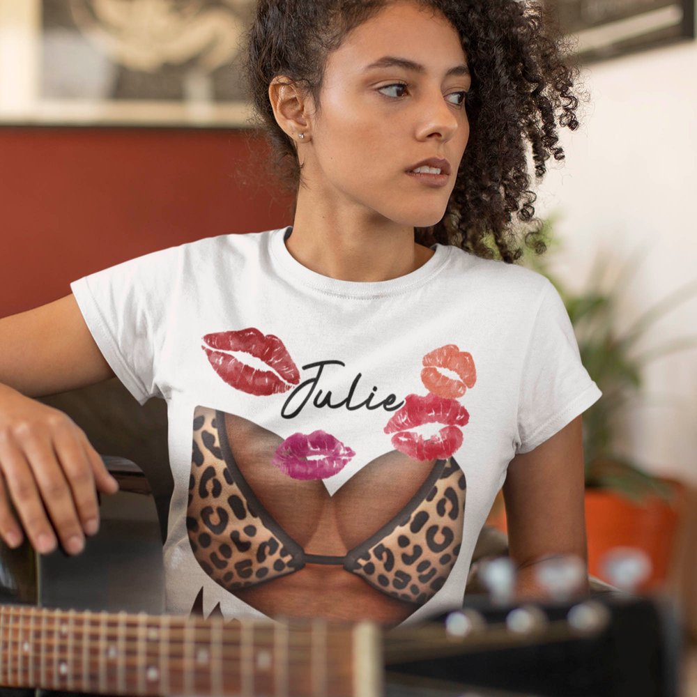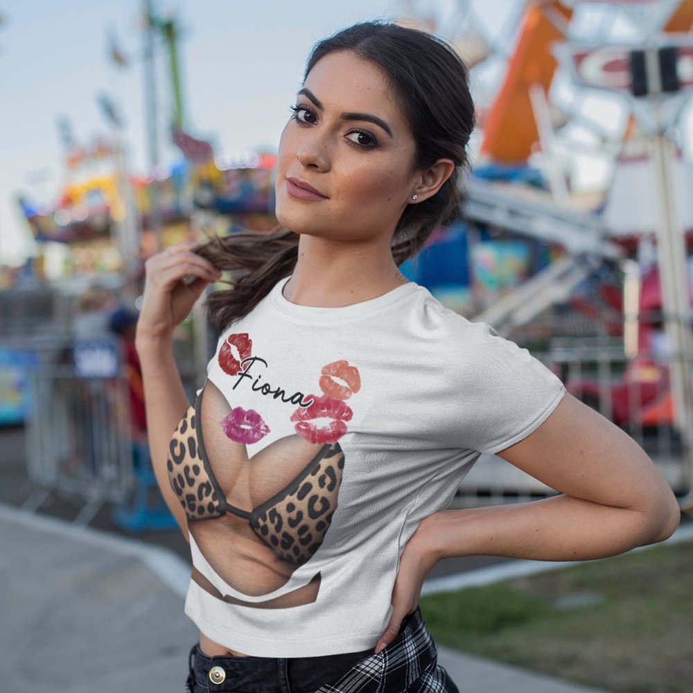 Con un llamativo estampado de bikini combinado con vibrantes marcas de beso, este crop top irradia seducción veraniega. Personalízalo con tu nombre para crear una pieza única y exclusiva para ti.