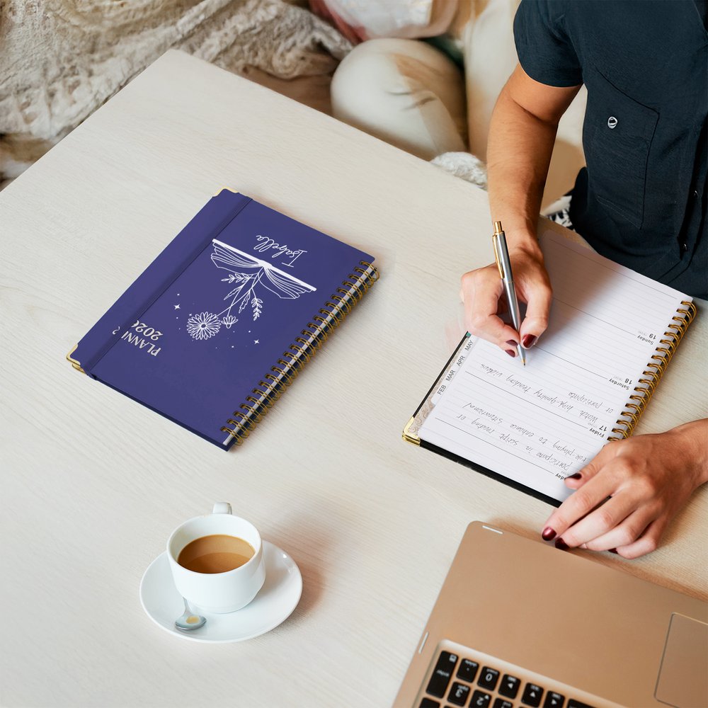 La agenda cuenta con una tapa dura de alta calidad con un acabado resistente a las manchas y los arañazos para soportar los golpes y el desgaste del uso diario, lo que garantiza que se mantenga nítida y bonita incluso después de una lectura prolongada. Las páginas interiores están hechas de papel ecológico de alta calidad, grueso y resistente a la pérdida de tinta, que permite una escritura suave y sin roces con la punta del bolígrafo, proporcionando una cómoda experiencia a la hora de tomar notas. La encuadernación metálica en espiral garantiza un paso de página suave, y la banda elástica incorporada y los insertos de los bolsillos combinan durabilidad y practicidad, garantizando que esta agenda para todo el año se mantenga en excelentes condiciones.