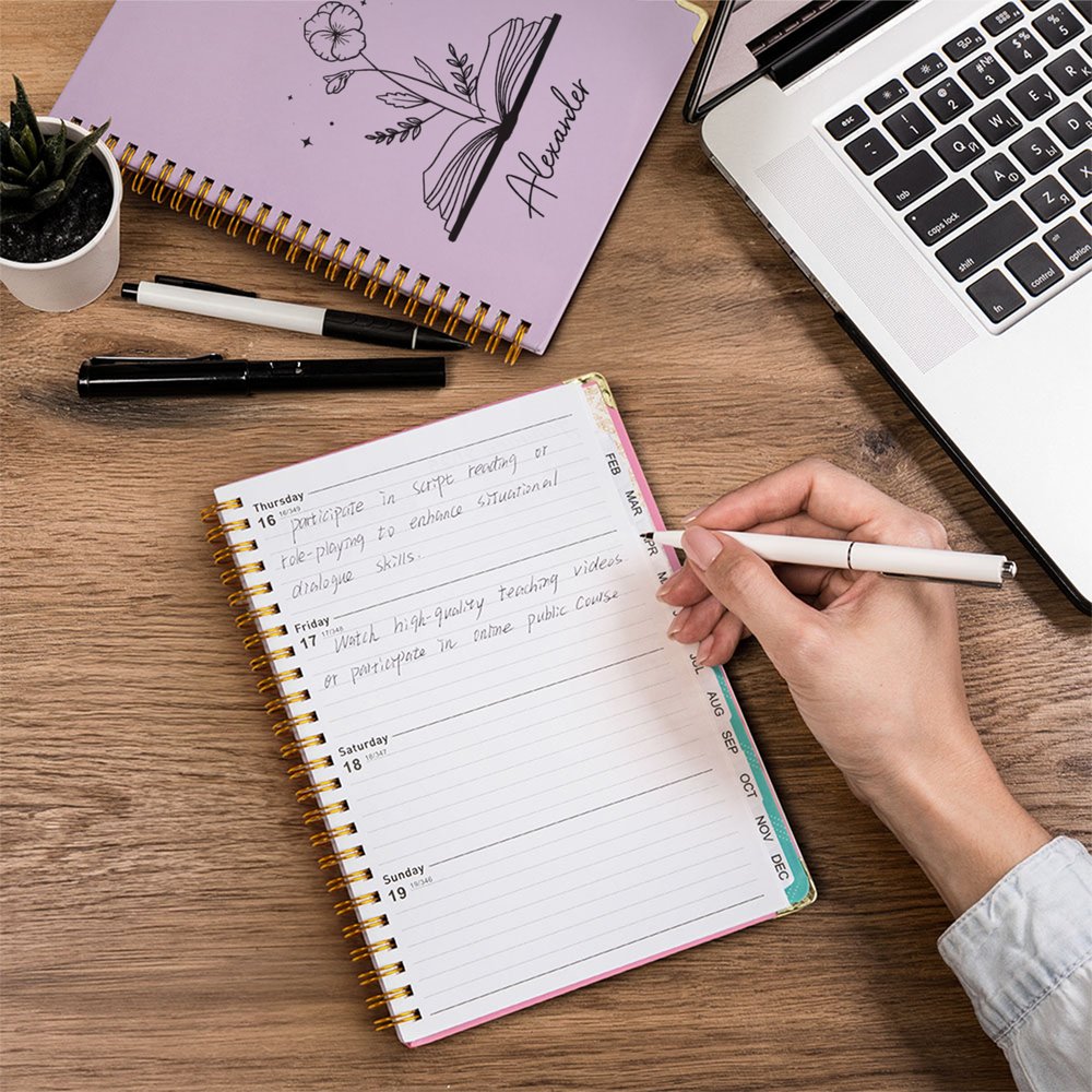 Esta agenda cuenta con una flor de nacimiento y un nombre personalizado como elementos centrales de su diseño. La flor de nacimiento del mes correspondiente aparece delicadamente representada en la portada. Los delicados pétalos y los elegantes colores transmiten una estética natural y refrescante. El nombre personalizado convierte cada agenda en un recuerdo único.