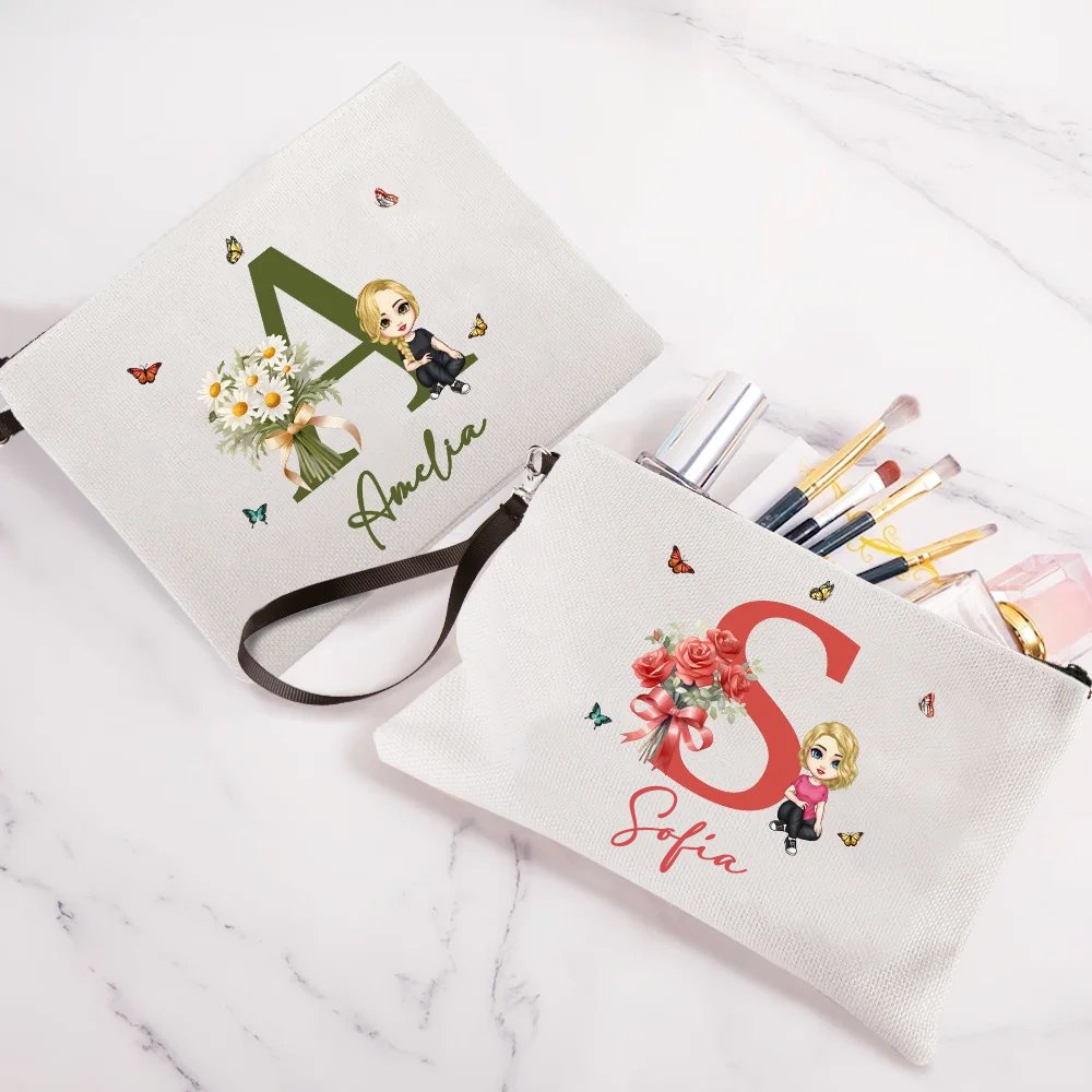 Esta bolsa de maquillaje de lona está diseñada con una simpática niña o mujer de dibujos animados, adornada con una bonita flor de nacimiento. Puedes personalizarla con tus iniciales y tu nombre para crear una bolsa única y personalizada.