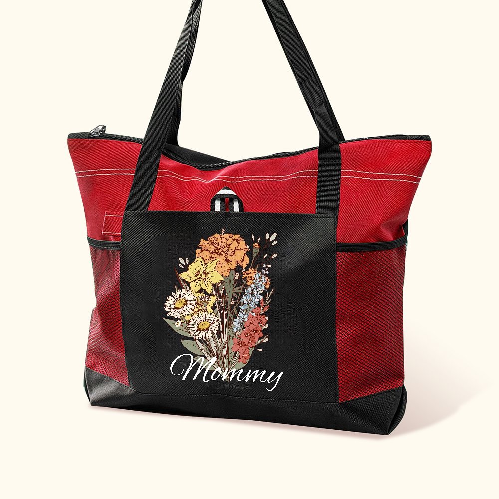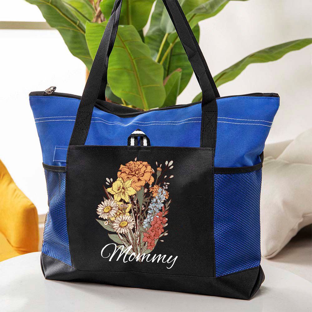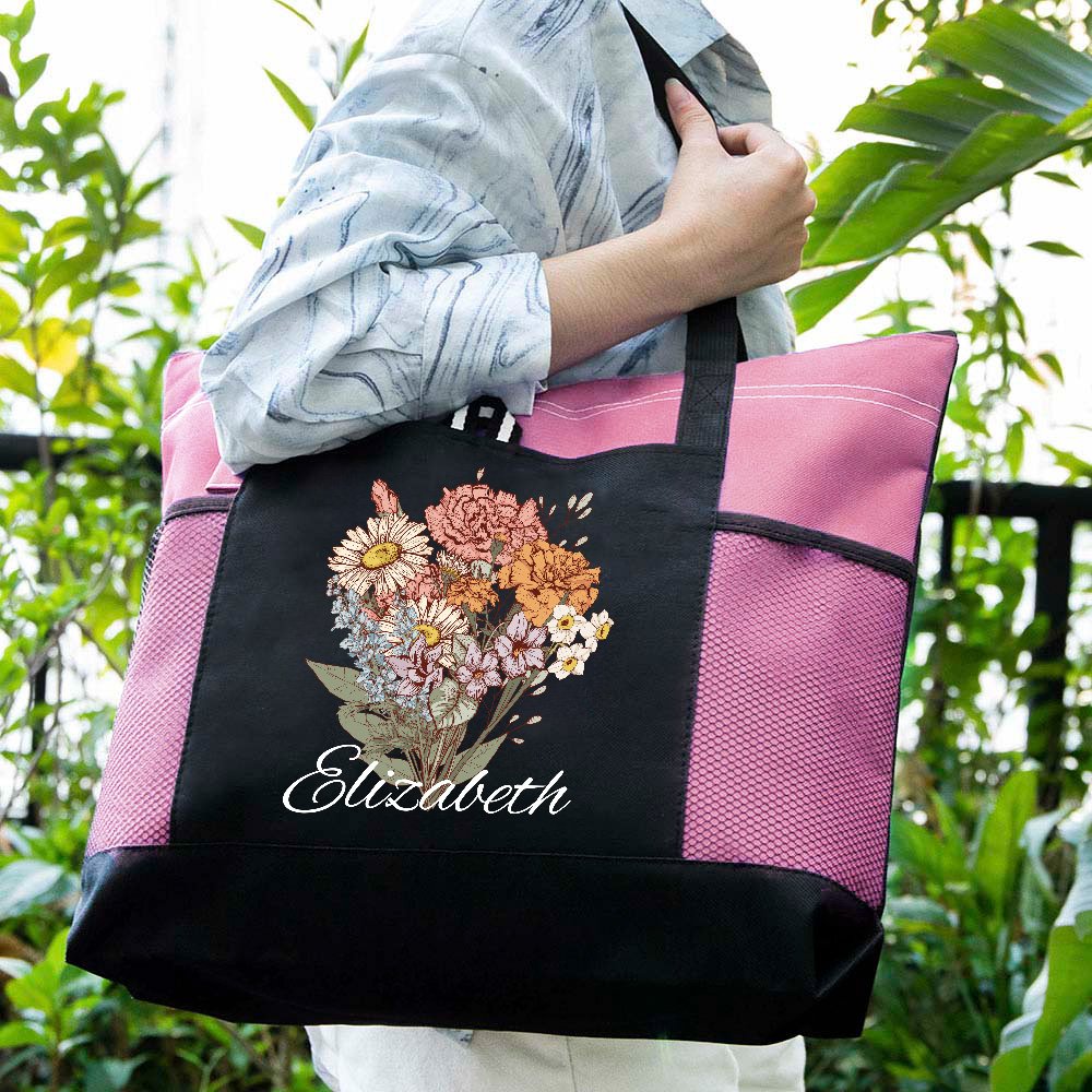 Esta bolsa de mano presenta un impresionante estampado de un ramo de flores de nacimiento, cada flor representa el mes de nacimiento de un niño y la parte de abajo se puede personalizar con el nombre de la madre o la abuela, creando así una bolsa de playa única y significativa y expresando amor y admiración por ellas.