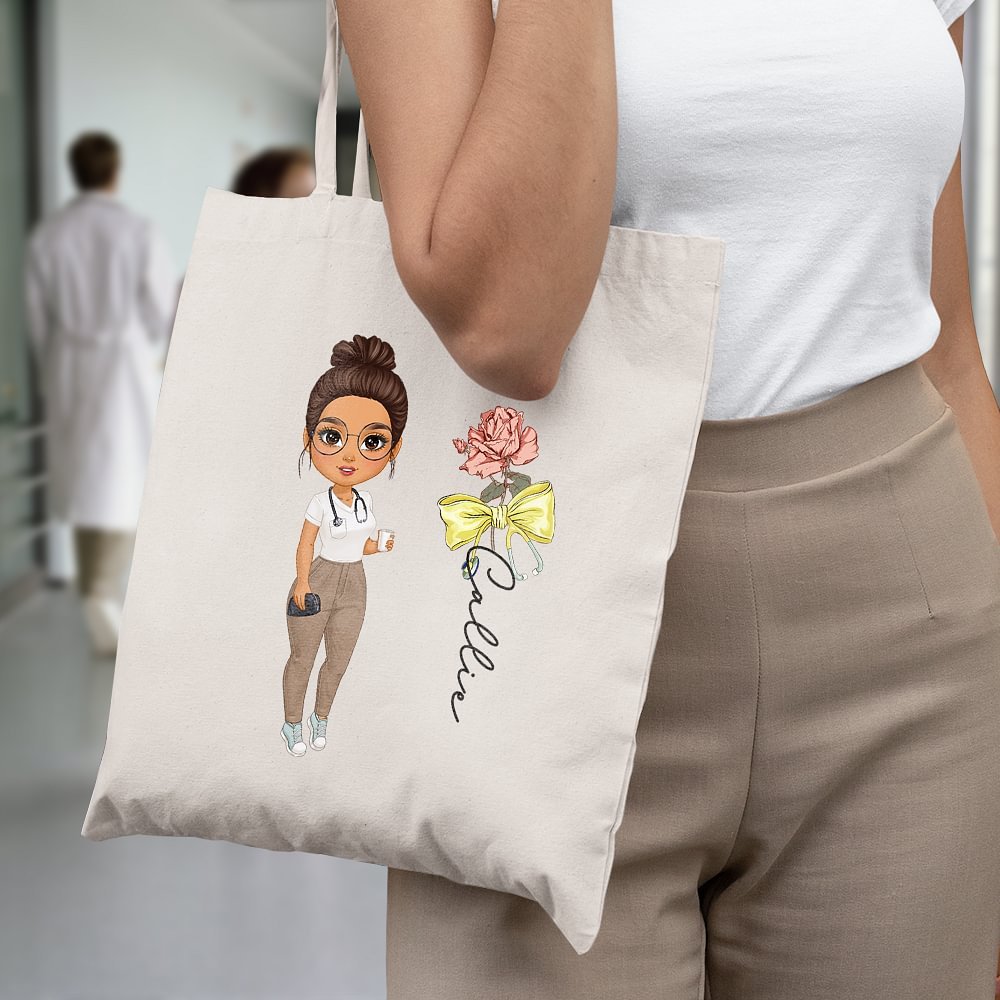 Este bolso de mano presenta un elegante diseño con la imagen de un personal médico femenino de dibujos animados impresa en la parte delantera y está decorado con encantadoras flores de cumpleaños y un divertido lazo de estetoscopio. Es elegante y práctica a la vez, lo que la convierte en el accesorio perfecto para los profesionales de la medicina. Imprima sus nombres en la bolsa para expresar su sincera gratitud y admiración por sus contribuciones.