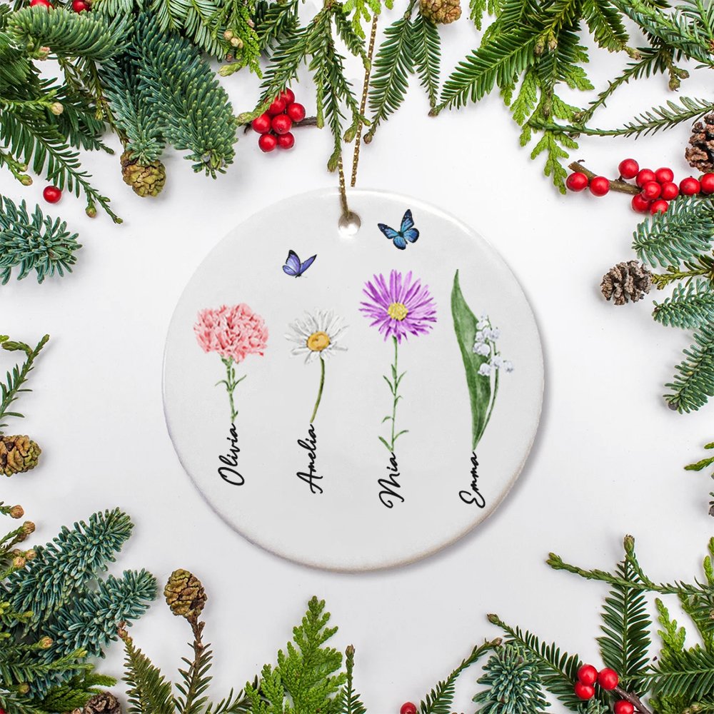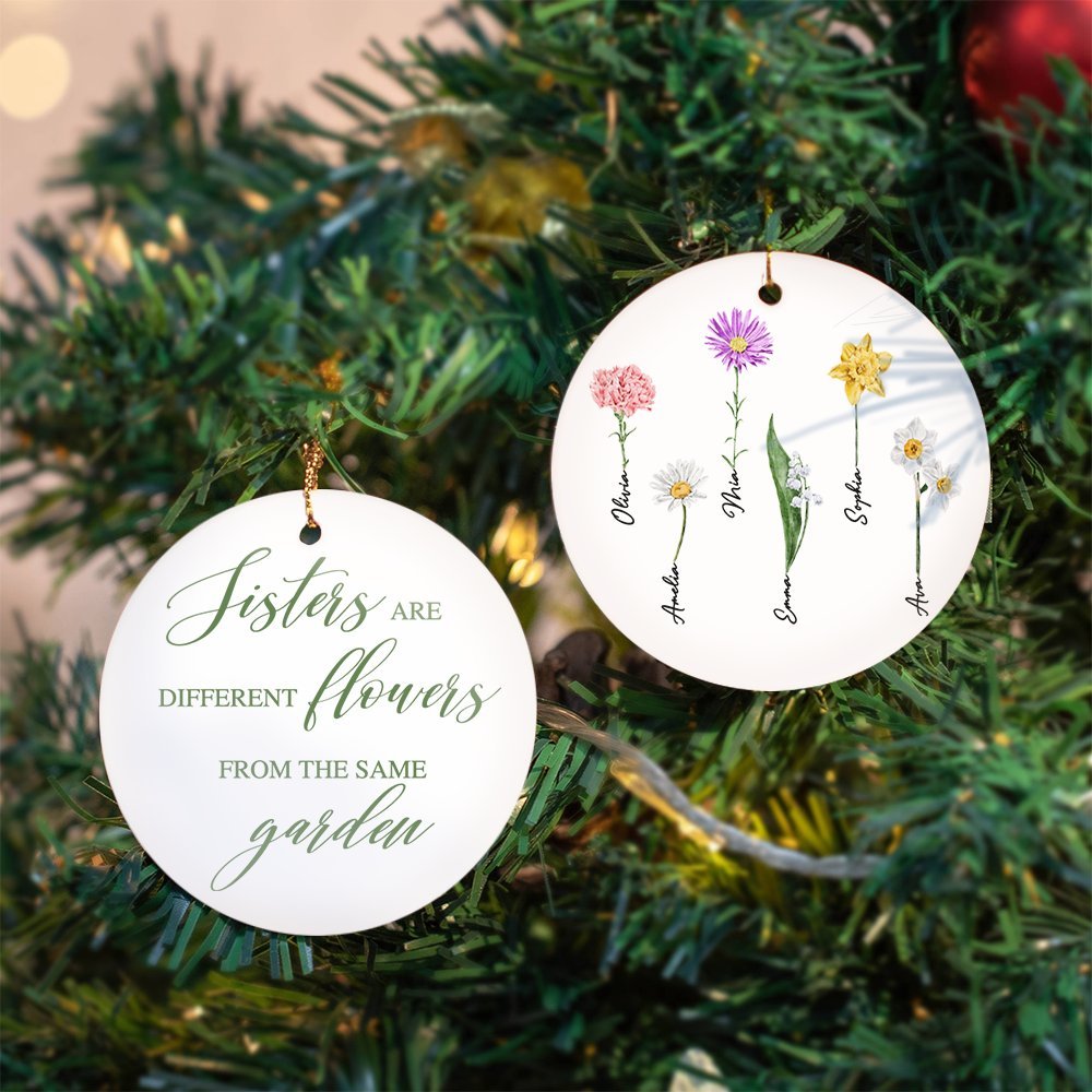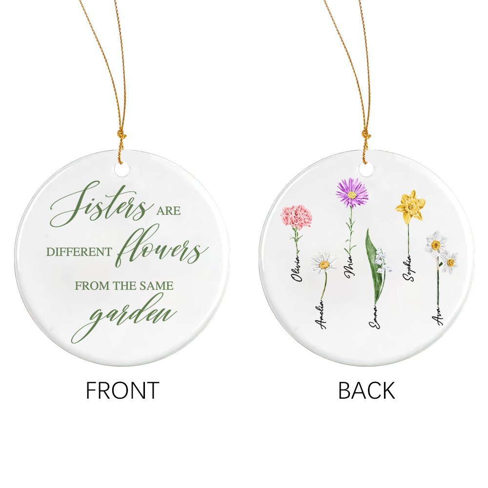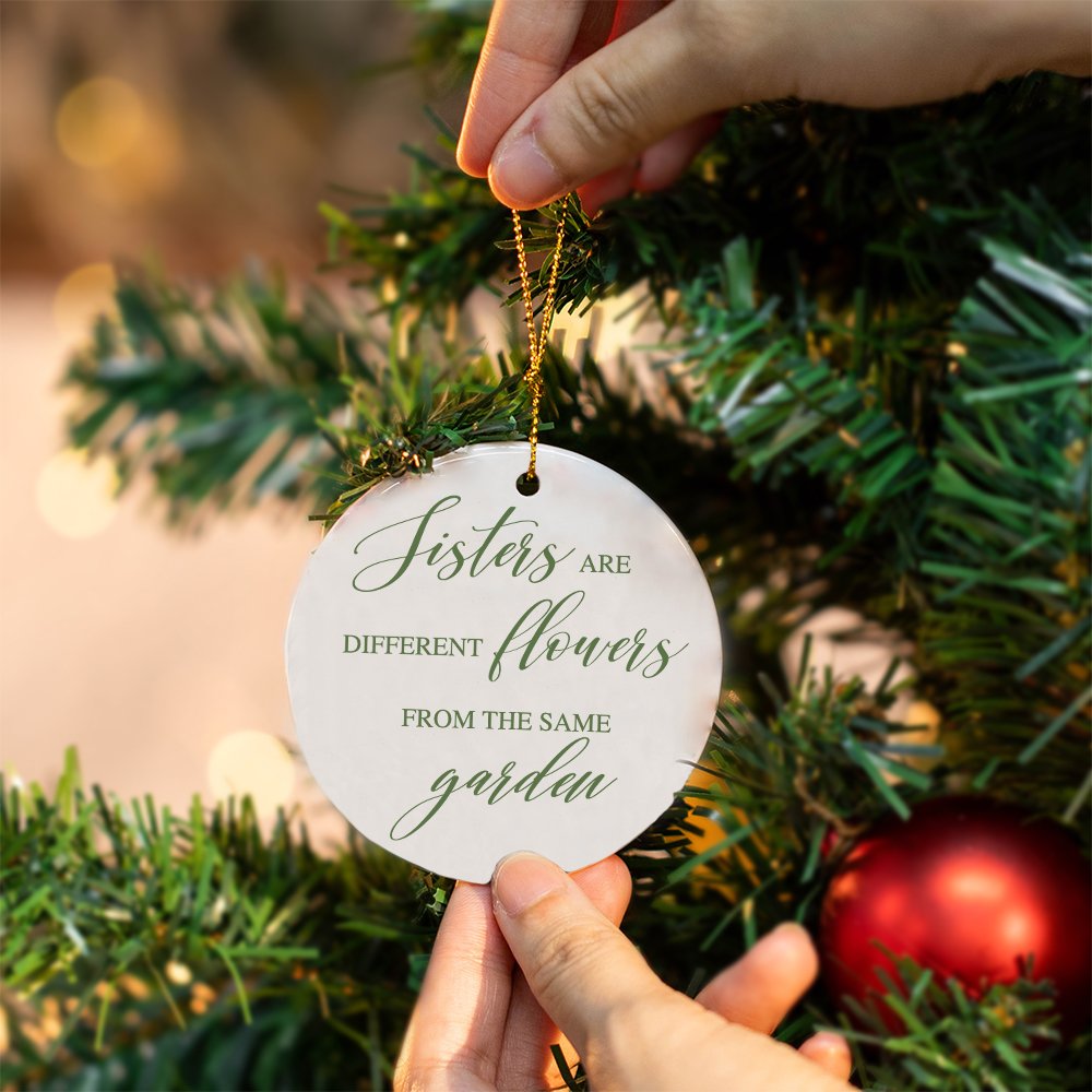 [DISEÑO ÚNICO: Diseño único de estilo jardín, con mariposas danzantes y 12 tipos de hermosas flores de cumpleaños, el lema personalizado "hermanas son diferentes flores del mismo jardín", representando hermanas son diferentes flores en el mismo jardín, expresando hermandad profundo afecto entre. Se puede colgar en el árbol de Navidad o en la pared para añadir un ambiente festivo en Navidad o en una fiesta.