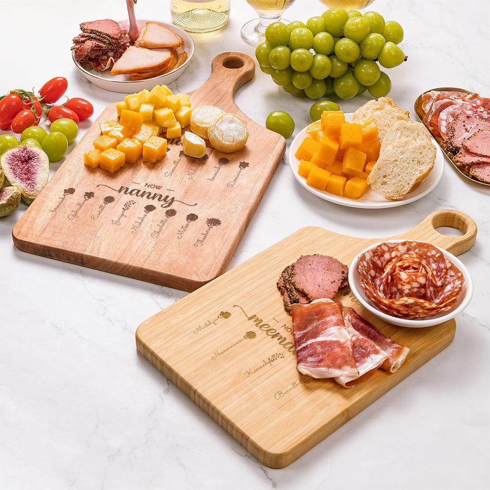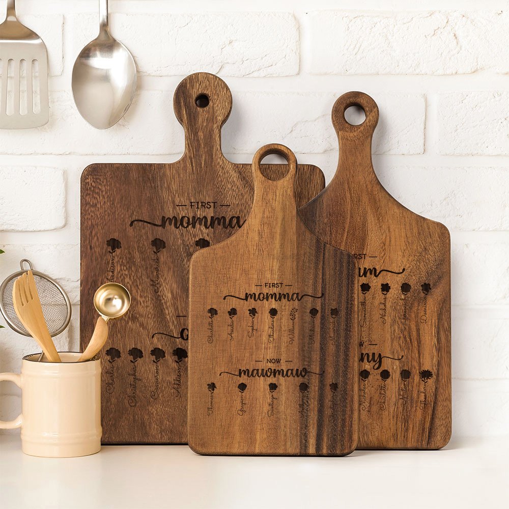 Esta tabla de cortar presenta un diseño de flor de cumpleaños bellamente tallado. Junto con el nombre y el saludo personalizables, muestra el proceso de transformación de la identidad familiar femenina y la estrecha conexión entre la familia.