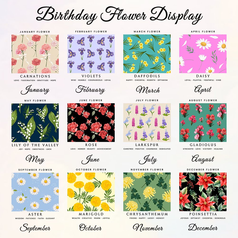 Este bolso de mano presenta las 12 flores natales del mes. Cada motivo floral va acompañado de su correspondiente mes, nombre y significado de la flor, creando un regalo delicado y atento. El diseño personalizable del nombre hace que el regalo sea aún más personal, combinando de forma inteligente el mes de su cumpleaños con un toque personal. Este detalle muestra su gusto único y añade un toque de romanticismo y estilo a cualquier atuendo cotidiano.