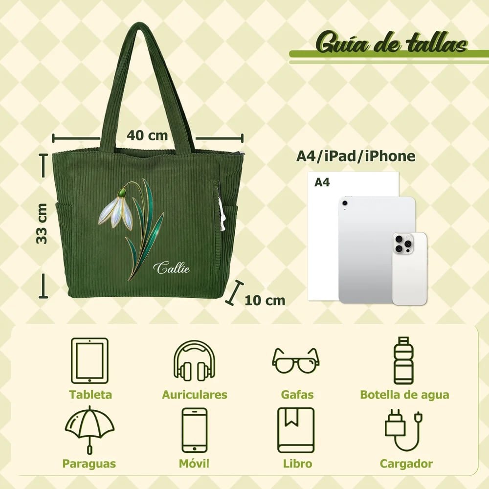 Con las flores de nacimiento como elemento característico, este bolso tote combina ingeniosamente motivos florales que representan cada mes con una textura de pana vintage. Personalizable con un nombre y disponible en varios colores, cada bolso se convierte en una expresión única de tu individualidad: un práctico accesorio cotidiano impregnado de simbolismo floral y significado.