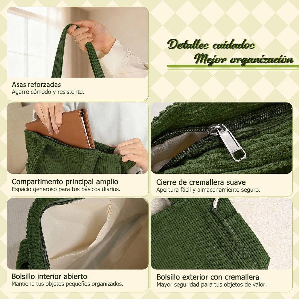 Con un espacioso interior en el que caben fácilmente carpetas, cosméticos, libros y mucho más, este bolso tote también incluye compartimentos integrados y bolsillos laterales para un almacenamiento organizado. La textura de pana vintage combinada con un delicado estampado de flores de nacimiento realza cualquier atuendo y facilita la transición entre los desplazamientos al trabajo, las compras, los viajes y el ocio. Ya sea con un estilo informal o profesional, añade un toque distintivo de elegancia a tu look diario.