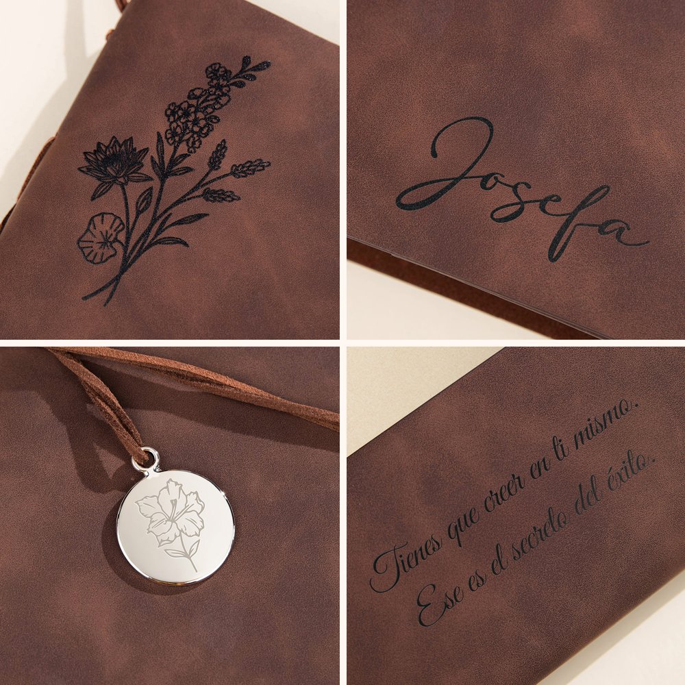 Con diseños minimalistas de flores de nacimiento en forma de líneas artísticas, añade una belleza sencilla y elegante a este cuaderno. La cubierta de cuero PU, el colgante en forma de hoja y la etiqueta redonda de metal capturan la esencia de la estética retro. Te ofrecemos 7 colores de cubierta, que puedes elegir según tus preferencias. También se puede personalizar con tu nombre para mostrar tu personalidad única.