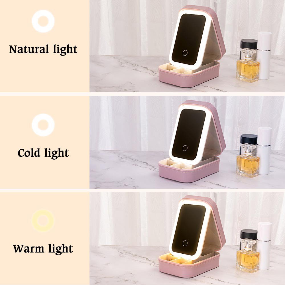 Este joyero viene con un espejo LED con tres configuraciones de color ajustables: luz cálida, luz natural y luz fría, que se pueden utilizar para crear diferentes ambientes. Viene con un cable de carga, que puede utilizarse durante aproximadamente una semana con una sola carga. Tanto si se prepara para salir por la noche como para un día informal, elije la luz que mejor se adapte a tus necesidades. Este práctico espejo es perfecto para maquillarte y comprobar tu aspecto.