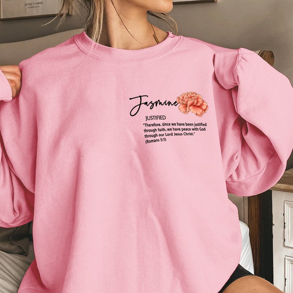 Esta exclusiva línea de ropa se inspira tanto en las flores de nacimiento como en la Biblia. La parte delantera tiene el texto fijo "Por lo tanto, ya que estamos justificados por la fe, tenemos paz con Dios por medio de nuestro Señor Jesucristo." Y puedes personalizarla con tu nombre, haciendo de cada pieza un recuerdo único que celebra los lazos familiares de una forma divertida y significativa.